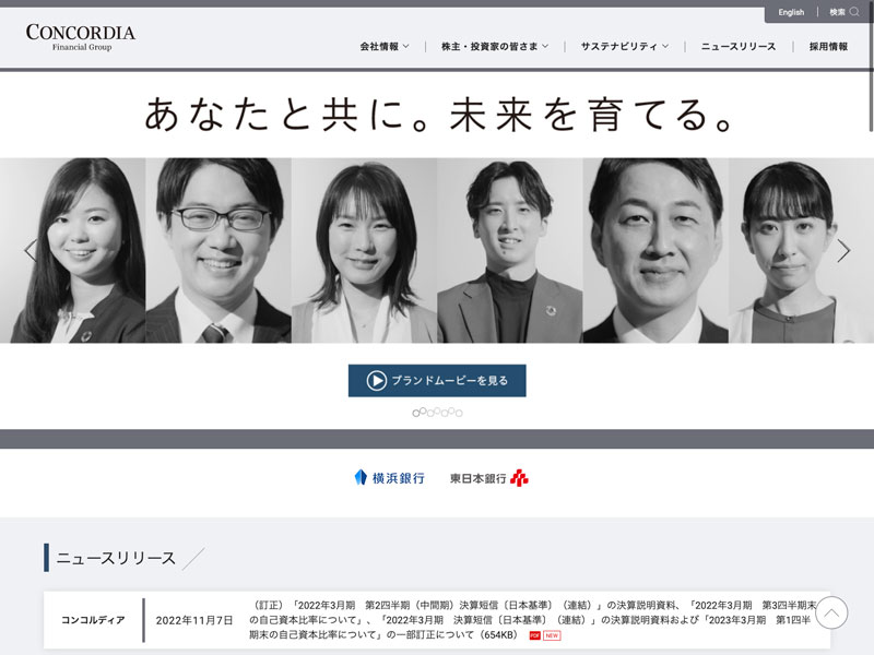 コンコルディア・フィナンシャルグループ Update:2022.10.31 カテゴリー:プライム 銀行業 コンプライアンス サステナビリティ ニュース一覧 プライバシーポリシー 有価証券報告書 沿革 社長メッセージ 経営理念 詳細 Visit 詳細 Visit