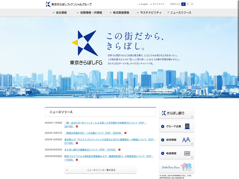 東京きらぼしフィナンシャルグループ Update:2022.10.31 カテゴリー:プライム 銀行業 コンプライアンス サステナビリティ ニュース一覧 プライバシーポリシー 有価証券報告書 沿革 経営理念 詳細 Visit 詳細 Visit