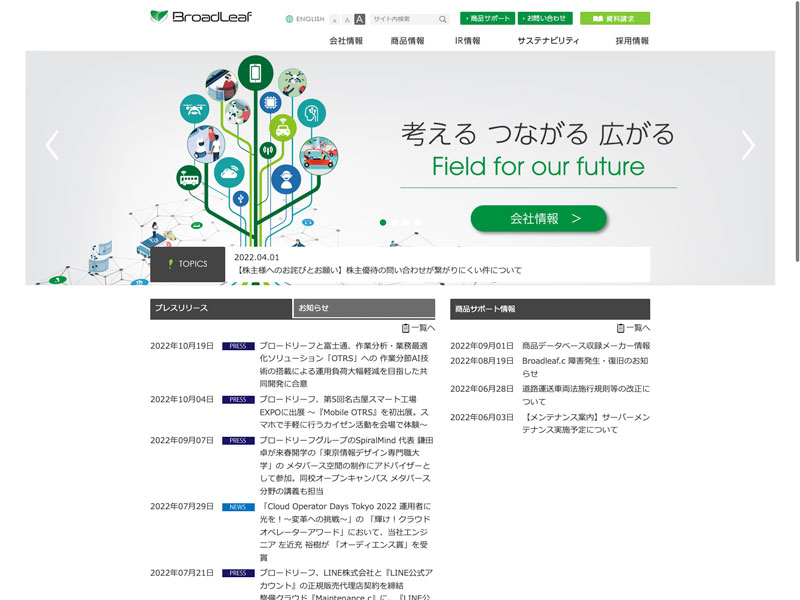 ブロードリーフ Update:2022.10.31 カテゴリー:プライム 情報・通信業 コンプライアンス サステナビリティ プライバシーポリシー 事業内容 免責注意事項 情報セキュリティ 有価証券報告書 沿革 社長メッセージ 詳細 Visit 詳細 Visit