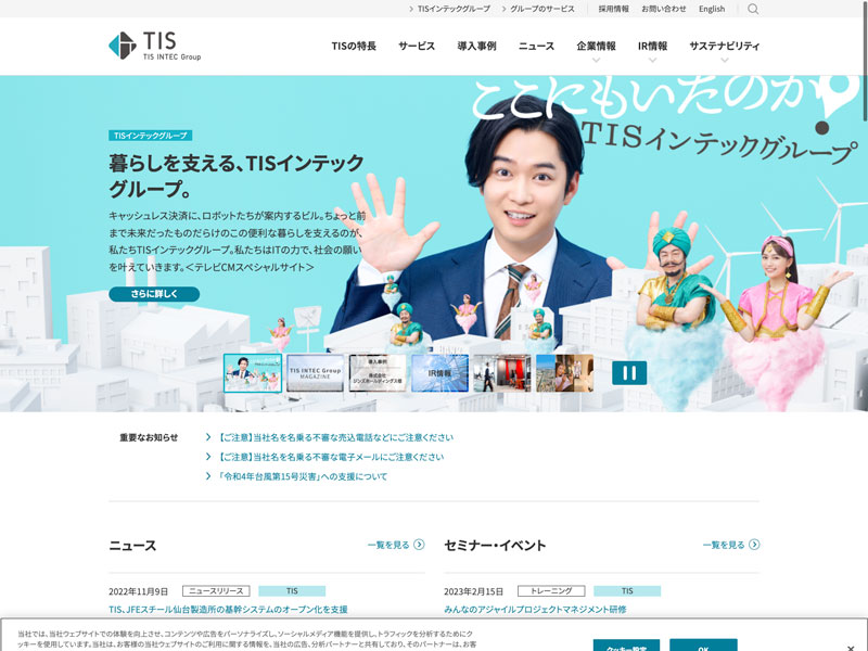 TIS Update:2022.10.31 カテゴリー:プライム 情報・通信業 コンプライアンス サステナビリティ プライバシーポリシー 事業内容 情報セキュリティ 沿革 詳細 Visit 詳細 Visit