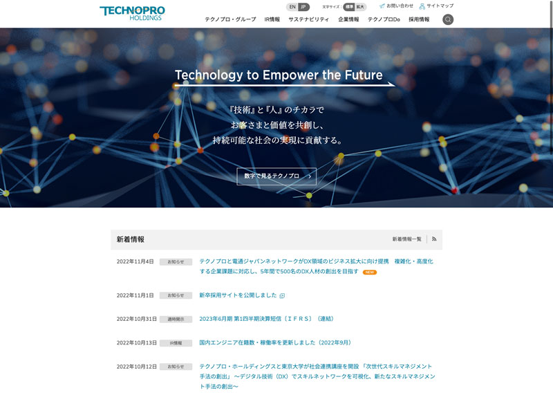 テクノプロ・ホールディングス Update:2022.10.31 カテゴリー:プライム サービス業 サステナビリティ プライバシーポリシー 免責注意事項 沿革 社長メッセージ 詳細 Visit 詳細 Visit