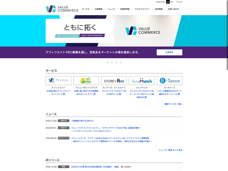バリューコマース Update:2022.10.31 カテゴリー:プライム サービス業 サステナビリティ ニュース一覧 プライバシーポリシー 免責注意事項 情報セキュリティ 有価証券報告書 沿革 社長メッセージ 詳細 Visit 詳細 Visit