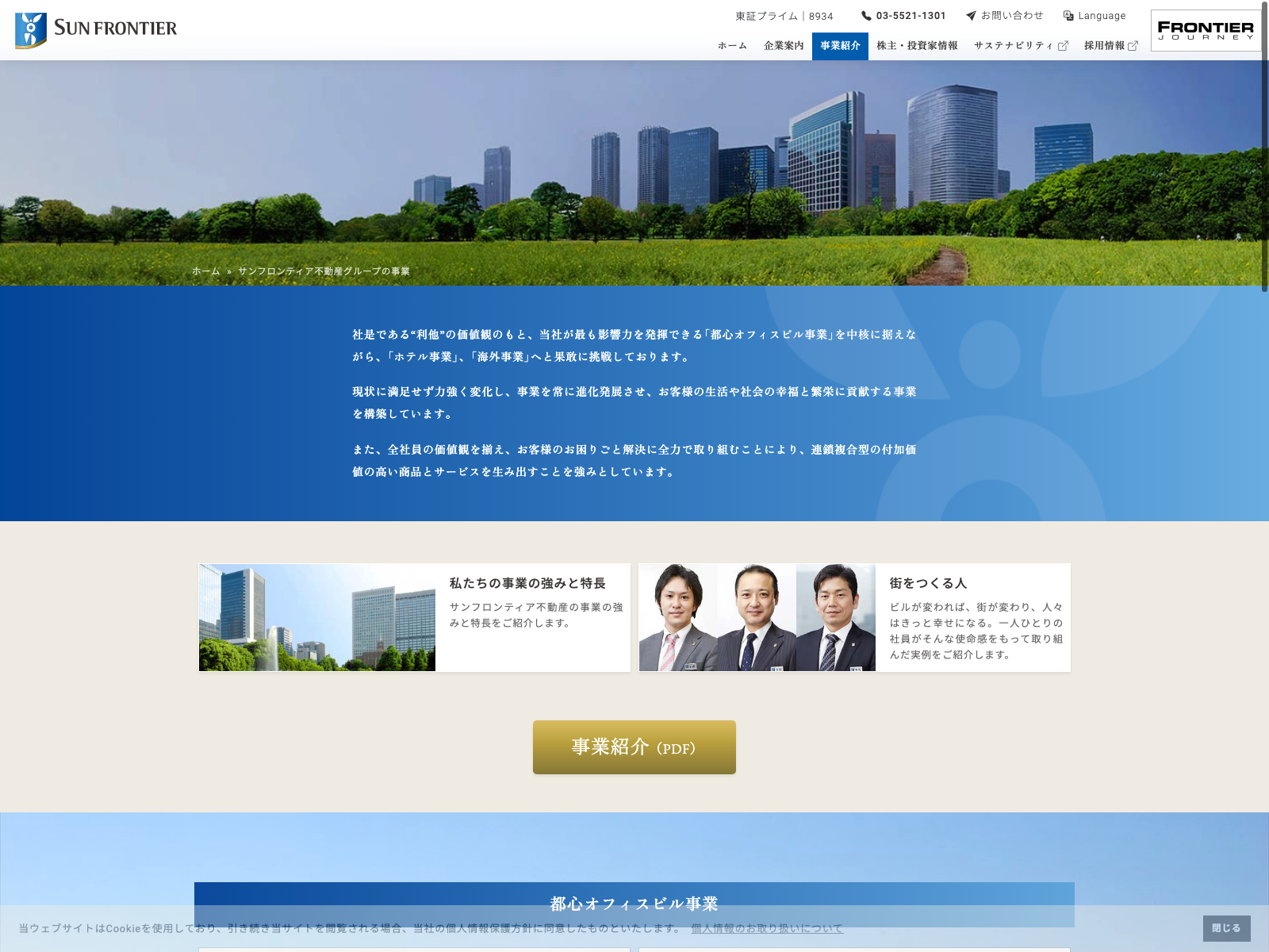 サンフロンティア不動産 Update:2022.10.31 カテゴリー:プライム 不動産業 サステナビリティ プライバシーポリシー 事業内容 免責注意事項 有価証券報告書 沿革 社長メッセージ 経営理念 詳細 Visit 詳細 Visit