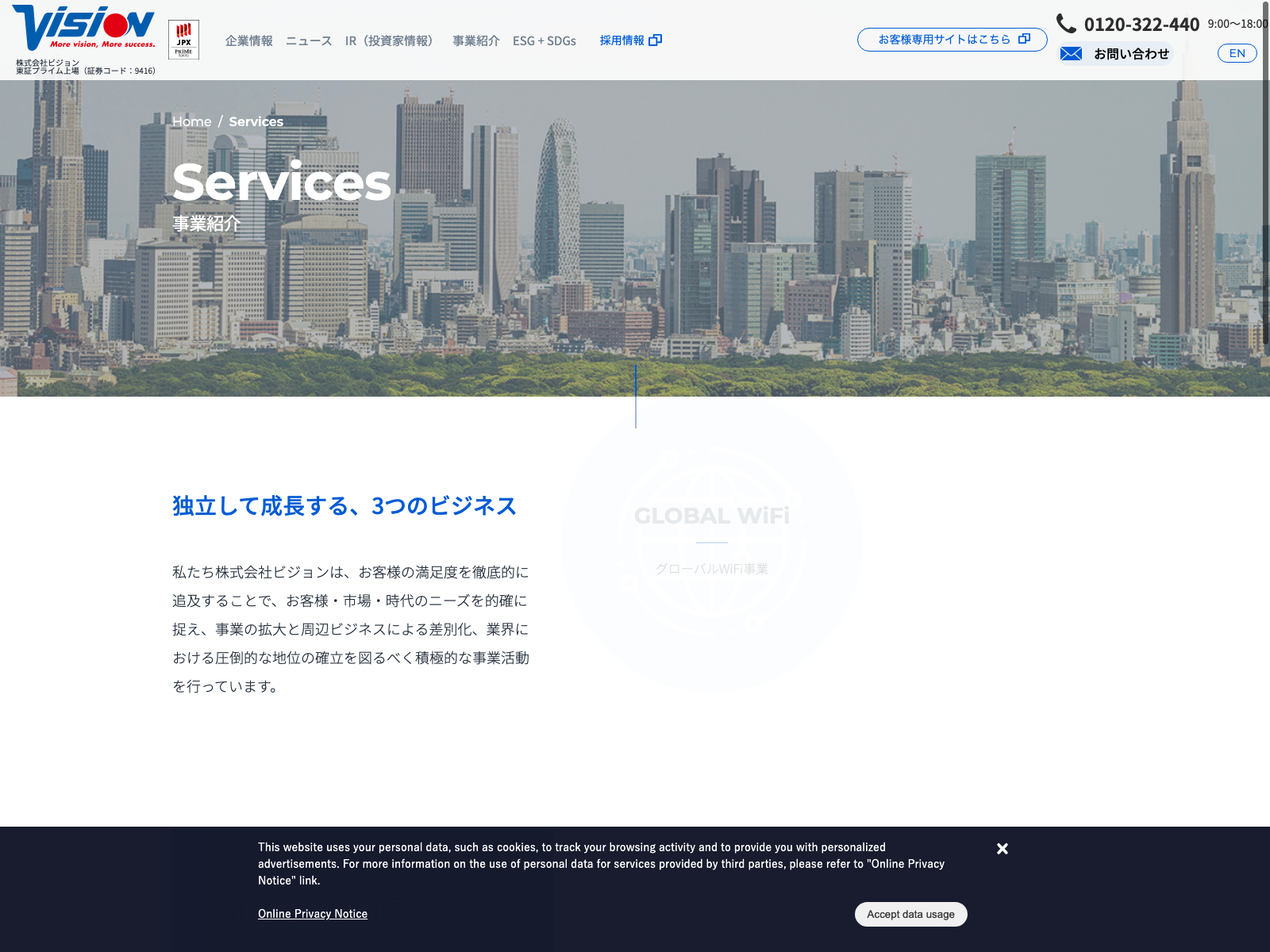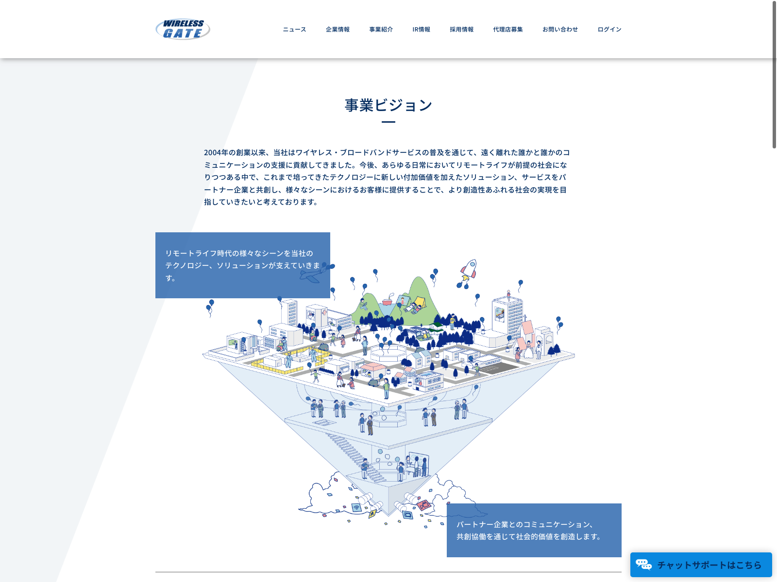 ワイヤレスゲート Update:2022.10.31 カテゴリー:プライム 情報・通信業 サステナビリティ ニュース一覧 プライバシーポリシー 事業内容 沿革 社長メッセージ 詳細 Visit 詳細 Visit