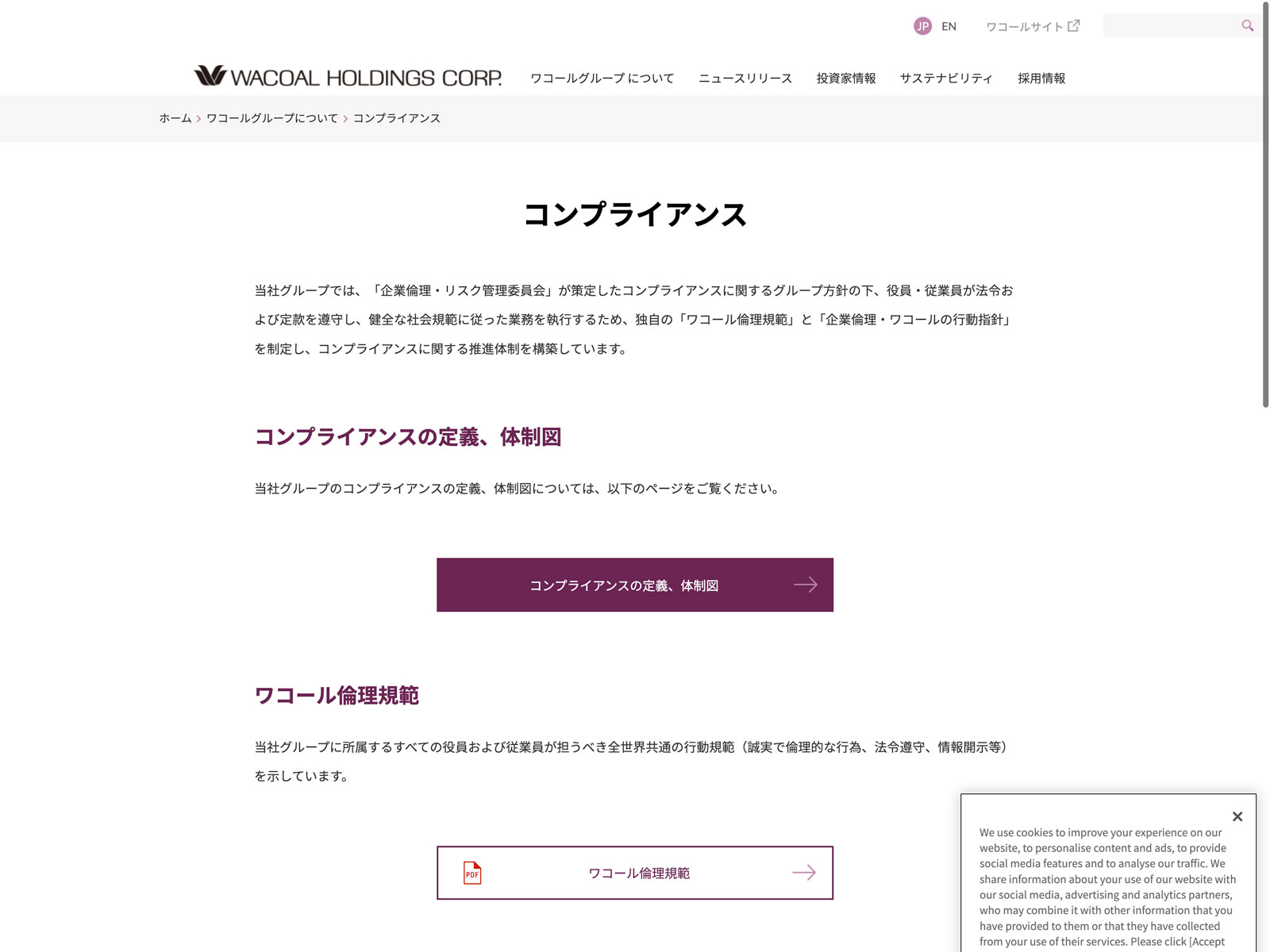 ワコールホールディングス Update:2022.10.31 カテゴリー:プライム 繊維製品 IR情報 コンプライアンス サステナビリティ ニュース一覧 プライバシーポリシー 経営理念 詳細 Visit 詳細 Visit