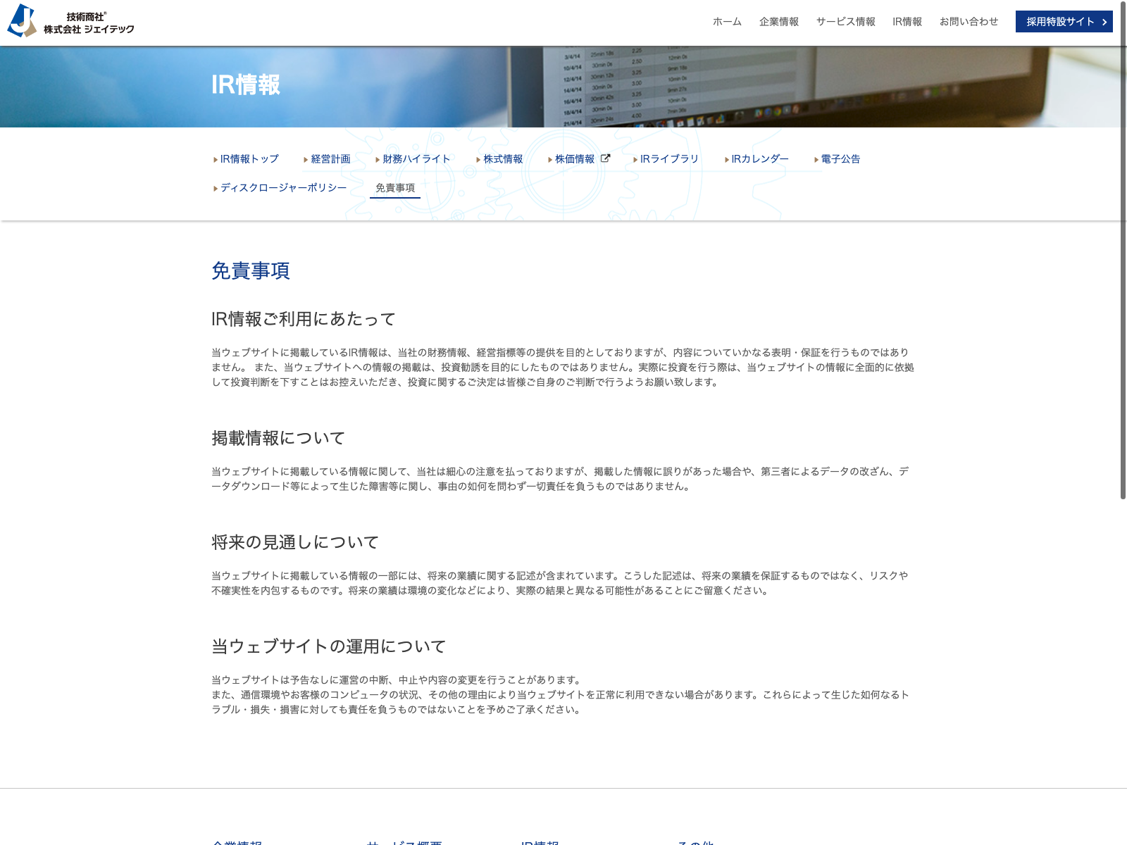ジェイテック Update:2022.10.31 カテゴリー:グロース サービス業 プライバシーポリシー 事業内容 免責注意事項 情報セキュリティ 沿革 社長メッセージ 経営理念 詳細 Visit 詳細 Visit