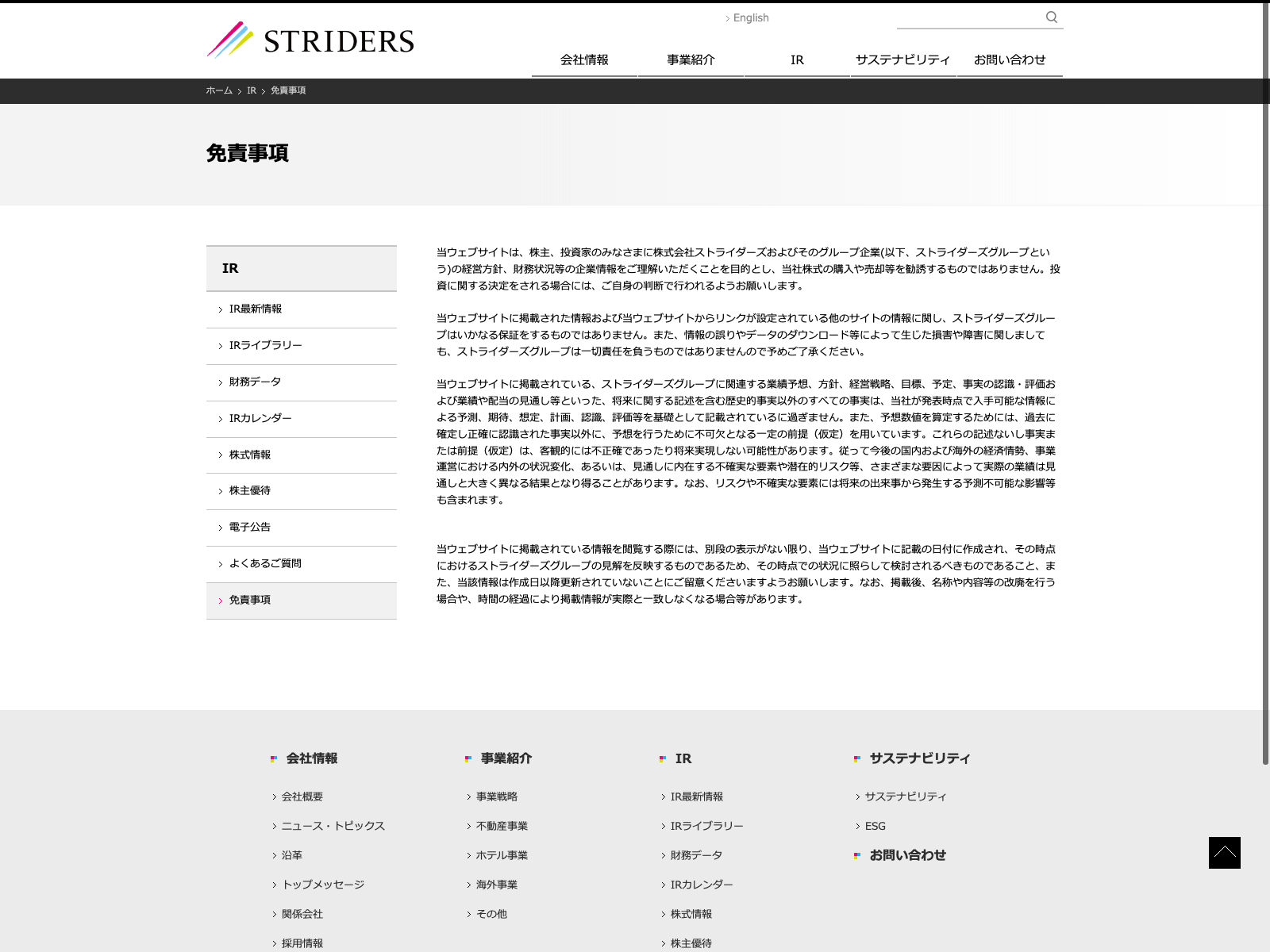 ストライダーズ Update:2022.10.31 カテゴリー:スタンダード 不動産業 サステナビリティ ニュース一覧 プライバシーポリシー 事業内容 免責注意事項 有価証券報告書 沿革 社長メッセージ 詳細 Visit 詳細 Visit