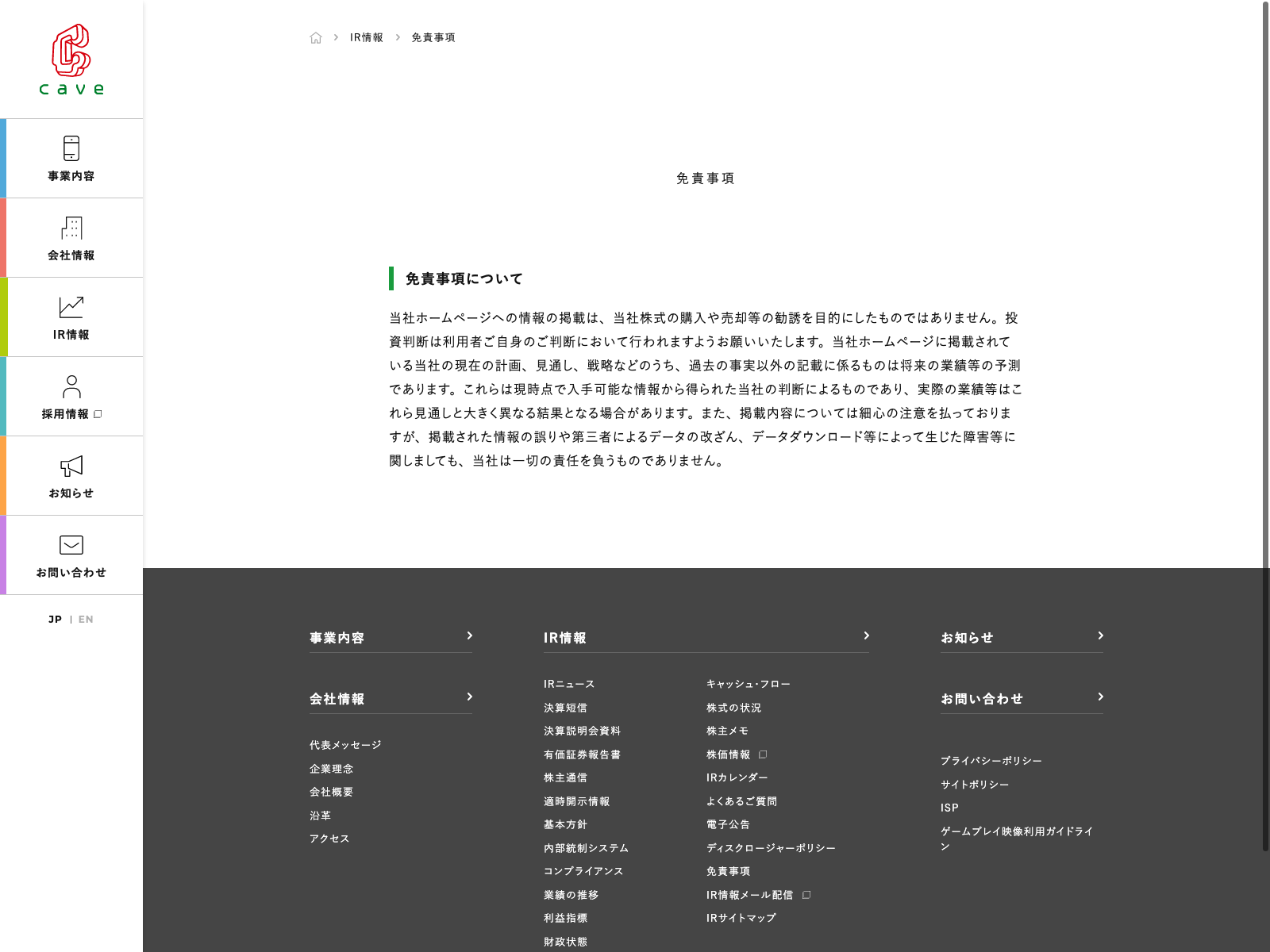 ケイブ Update:2022.10.31 カテゴリー:スタンダード 情報・通信業 コンプライアンス ニュース一覧 事業内容 免責注意事項 有価証券報告書 沿革 社長メッセージ 詳細 Visit 詳細 Visit