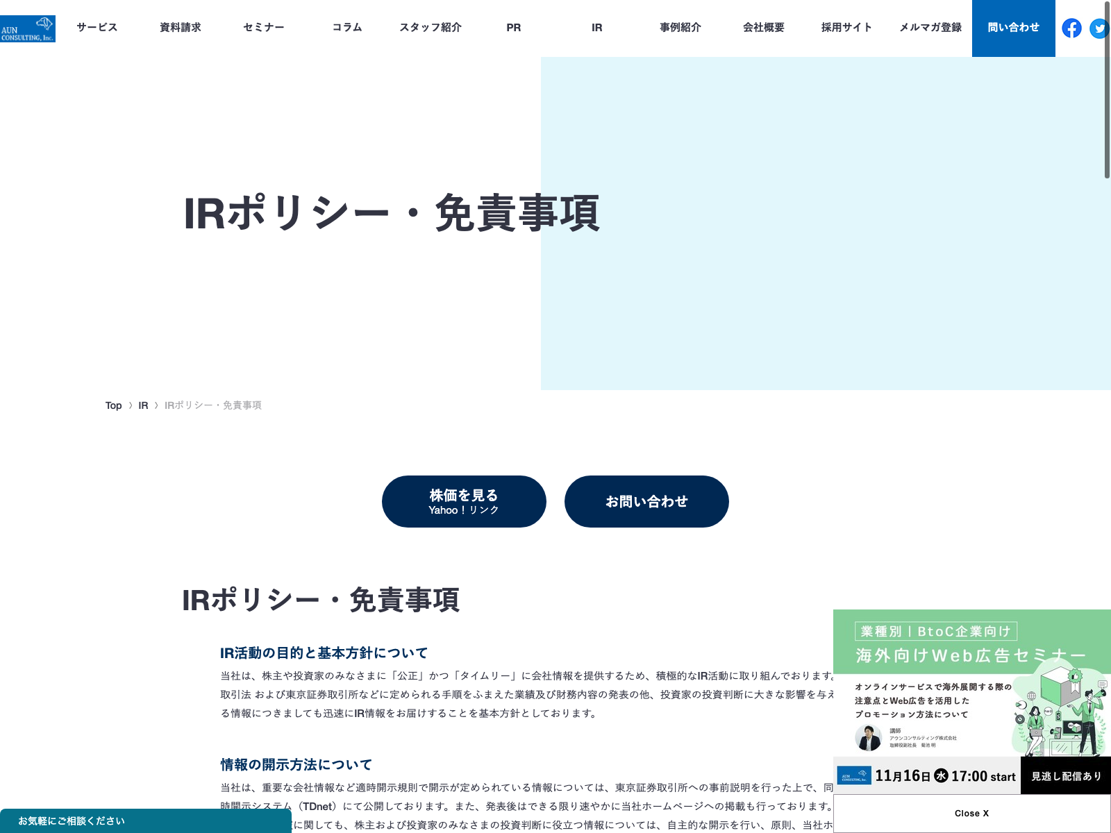 アウンコンサルティング Update:2022.10.31 カテゴリー:スタンダード サービス業 プライバシーポリシー 免責注意事項 情報セキュリティ 沿革 経営理念 詳細 Visit 詳細 Visit