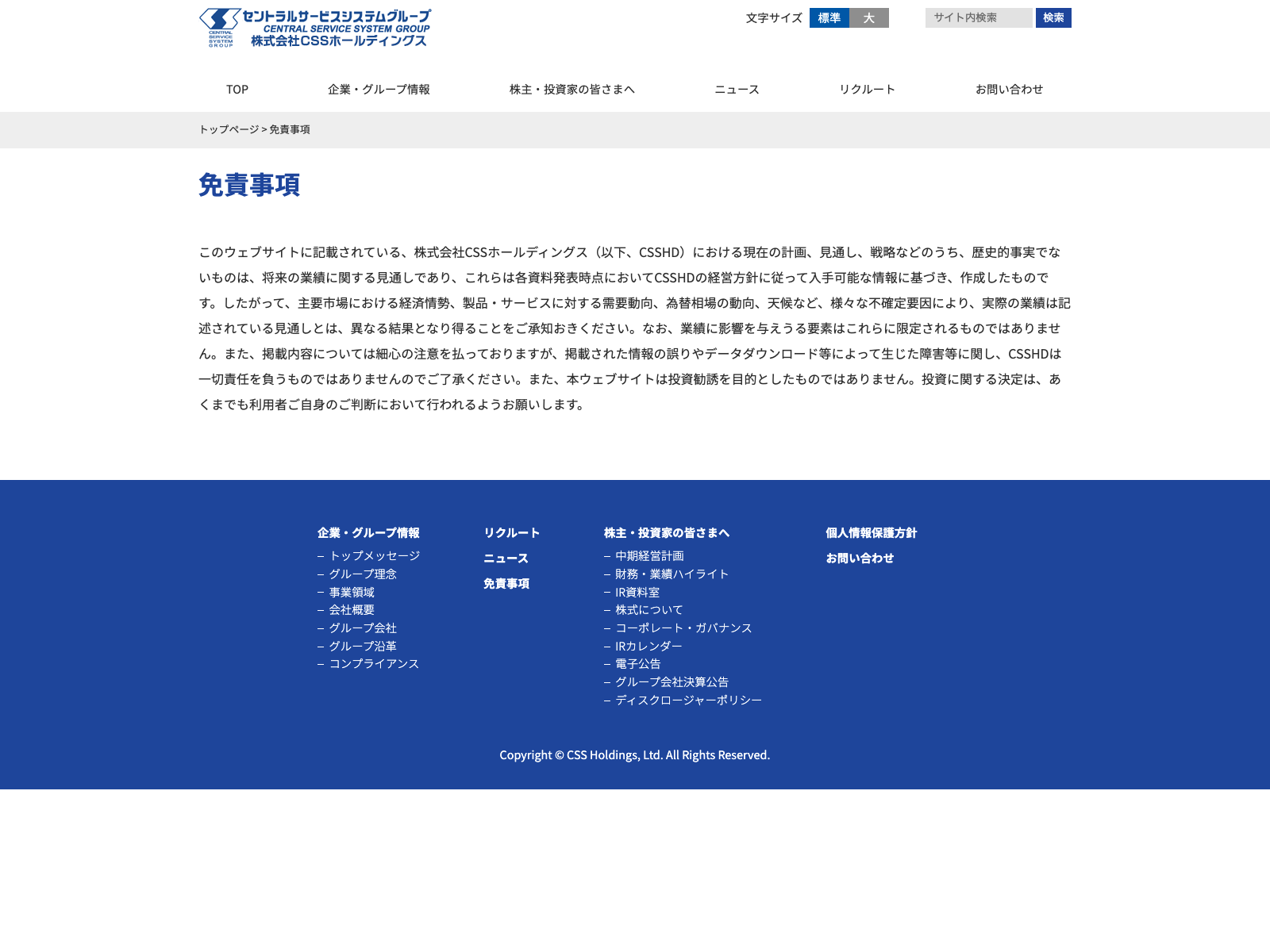 CSSホールディングス Update:2022.10.31 カテゴリー:スタンダード サービス業 コンプライアンス ニュース一覧 プライバシーポリシー 事業内容 免責注意事項 有価証券報告書 沿革 詳細 Visit 詳細 Visit