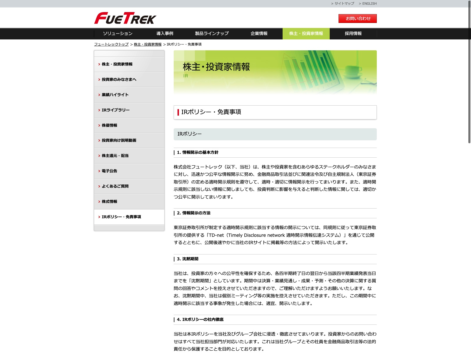 フュートレック Update:2022.10.31 カテゴリー:スタンダード サービス業 サステナビリティ プライバシーポリシー 事業内容 免責注意事項 情報セキュリティ 沿革 詳細 Visit 詳細 Visit