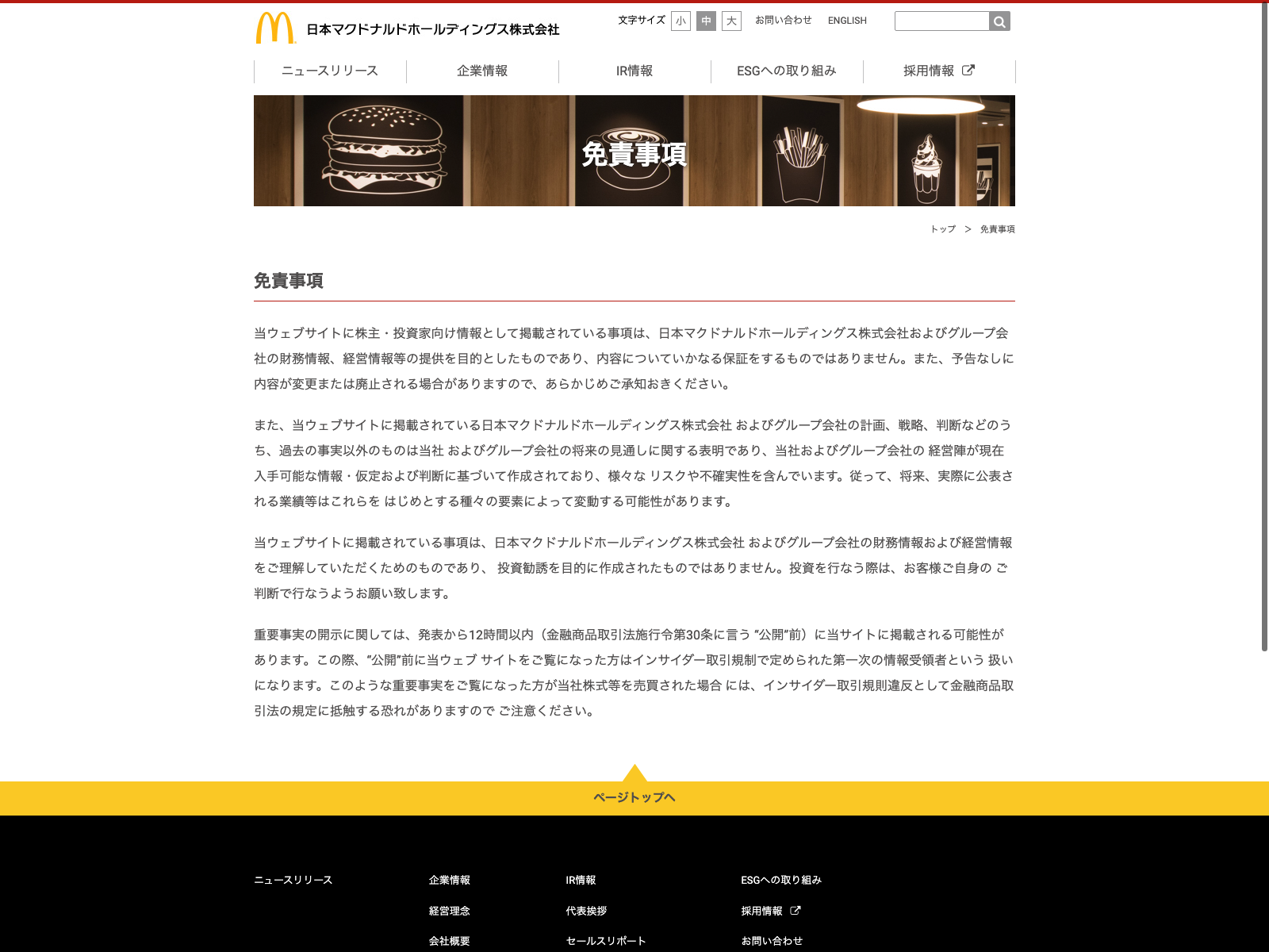日本マクドナルドホールディングス Update:2022.10.31 カテゴリー:スタンダード 小売業 コンプライアンス プライバシーポリシー 免責注意事項 沿革 経営理念 詳細 Visit 詳細 Visit
