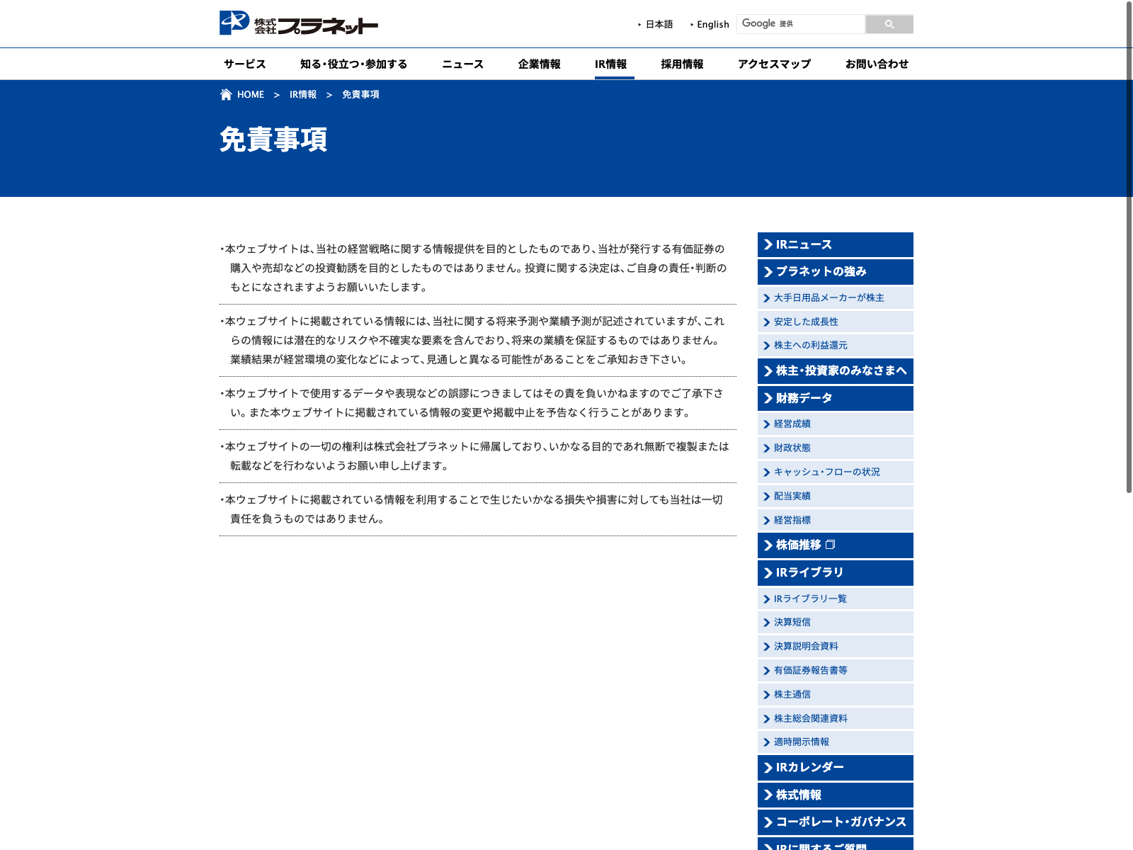 プラネット Update:2022.10.31 カテゴリー:スタンダード サービス業 コンプライアンス プライバシーポリシー 免責注意事項 情報セキュリティ 有価証券報告書 経営理念 詳細 Visit 詳細 Visit