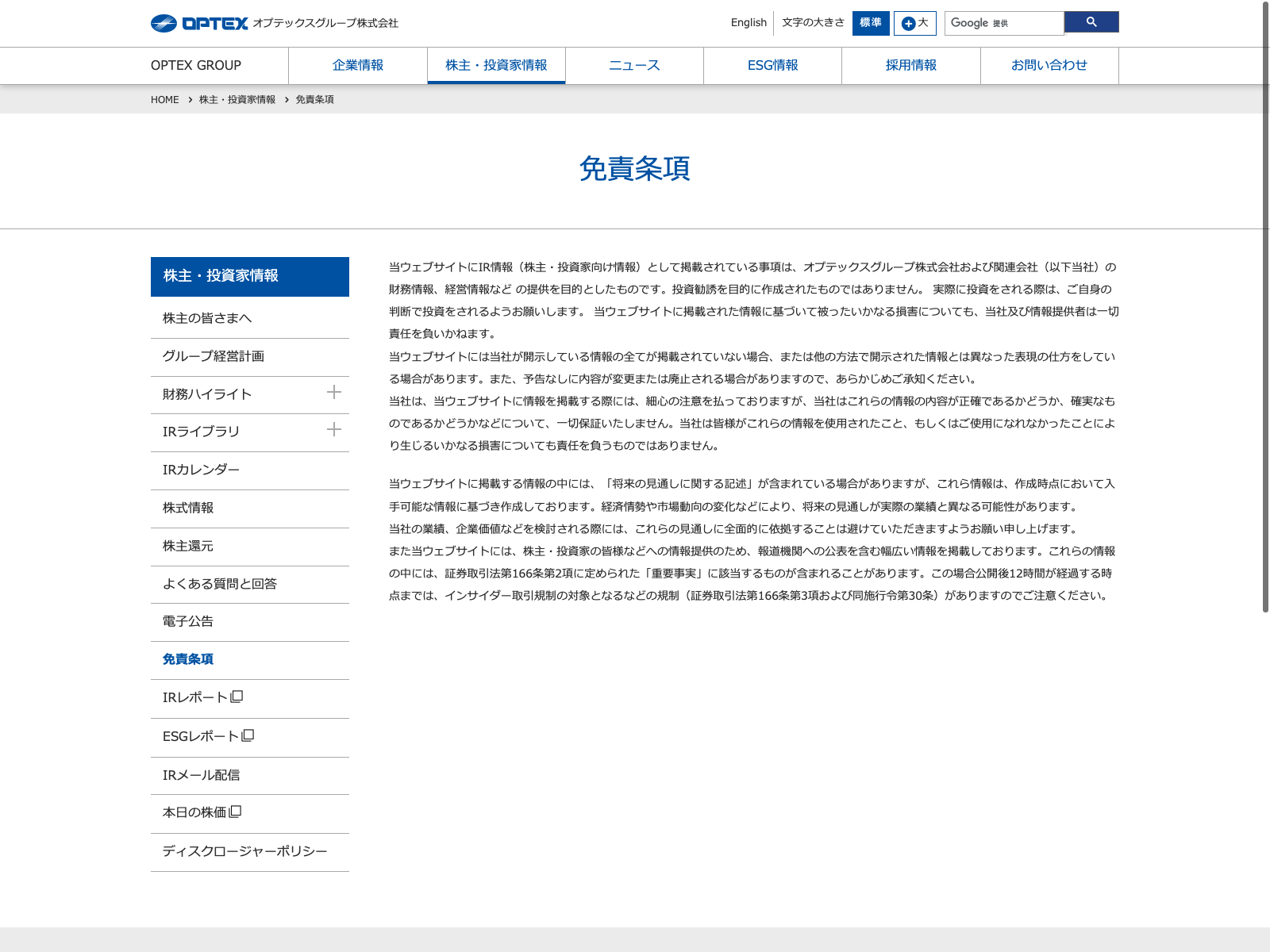 オプテックスグループ Update:2022.10.31 カテゴリー:プライム 電気機器 コンプライアンス ニュース一覧 プライバシーポリシー 免責注意事項 有価証券報告書 沿革 社長メッセージ 詳細 Visit 詳細 Visit