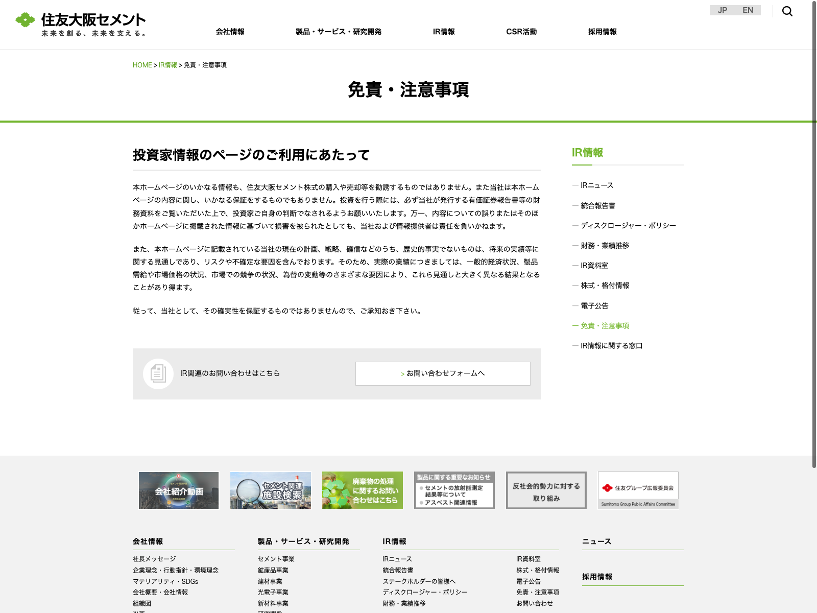 住友大阪セメント Update:2022.10.31 カテゴリー:プライム ガラス・土石製品 コンプライアンス プライバシーポリシー 免責注意事項 沿革 社長メッセージ 詳細 Visit 詳細 Visit