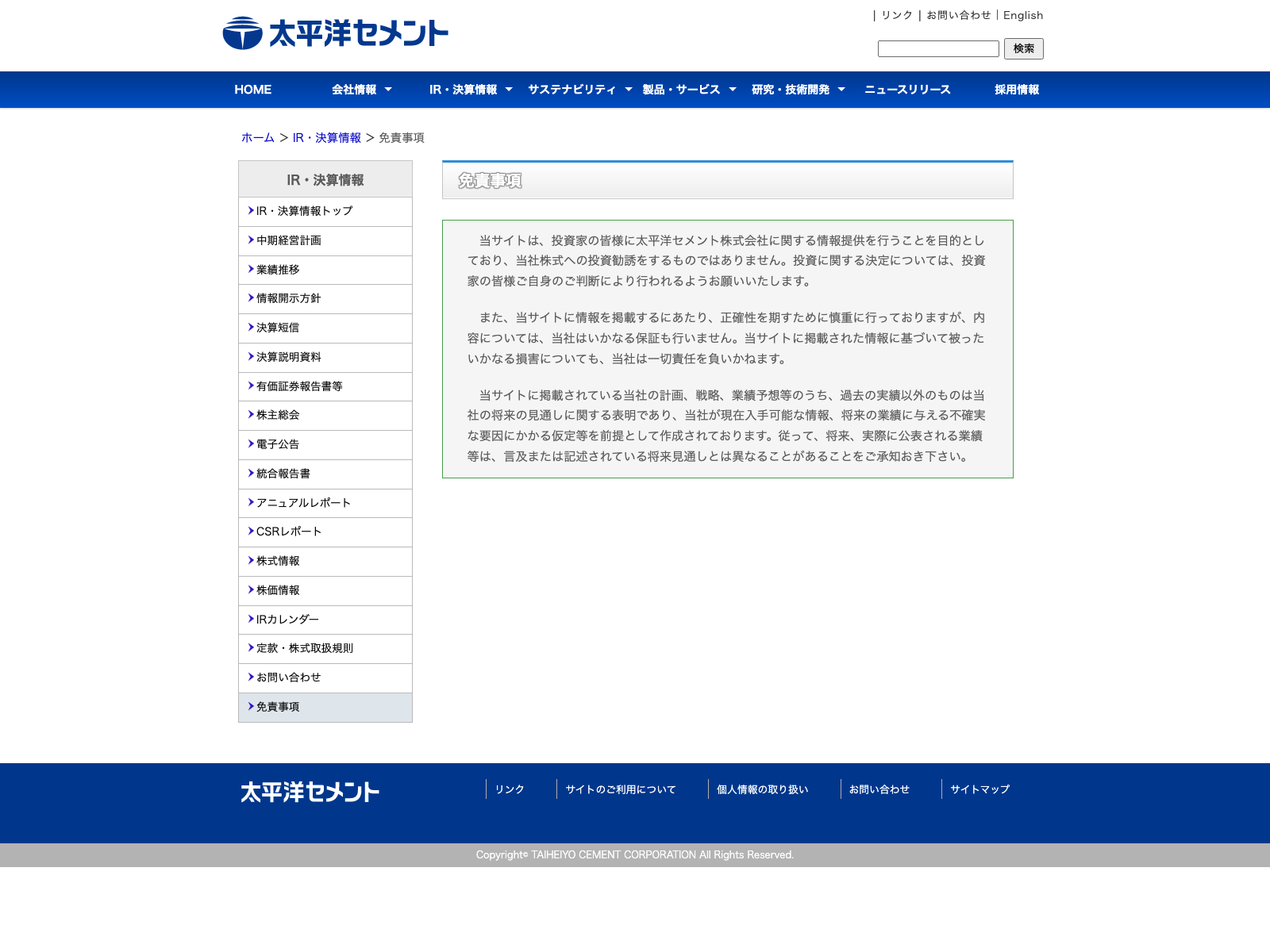 太平洋セメント Update:2022.10.31 カテゴリー:プライム ガラス・土石製品 サステナビリティ ニュース一覧 プライバシーポリシー 免責注意事項 有価証券報告書 沿革 経営理念 詳細 Visit 詳細 Visit