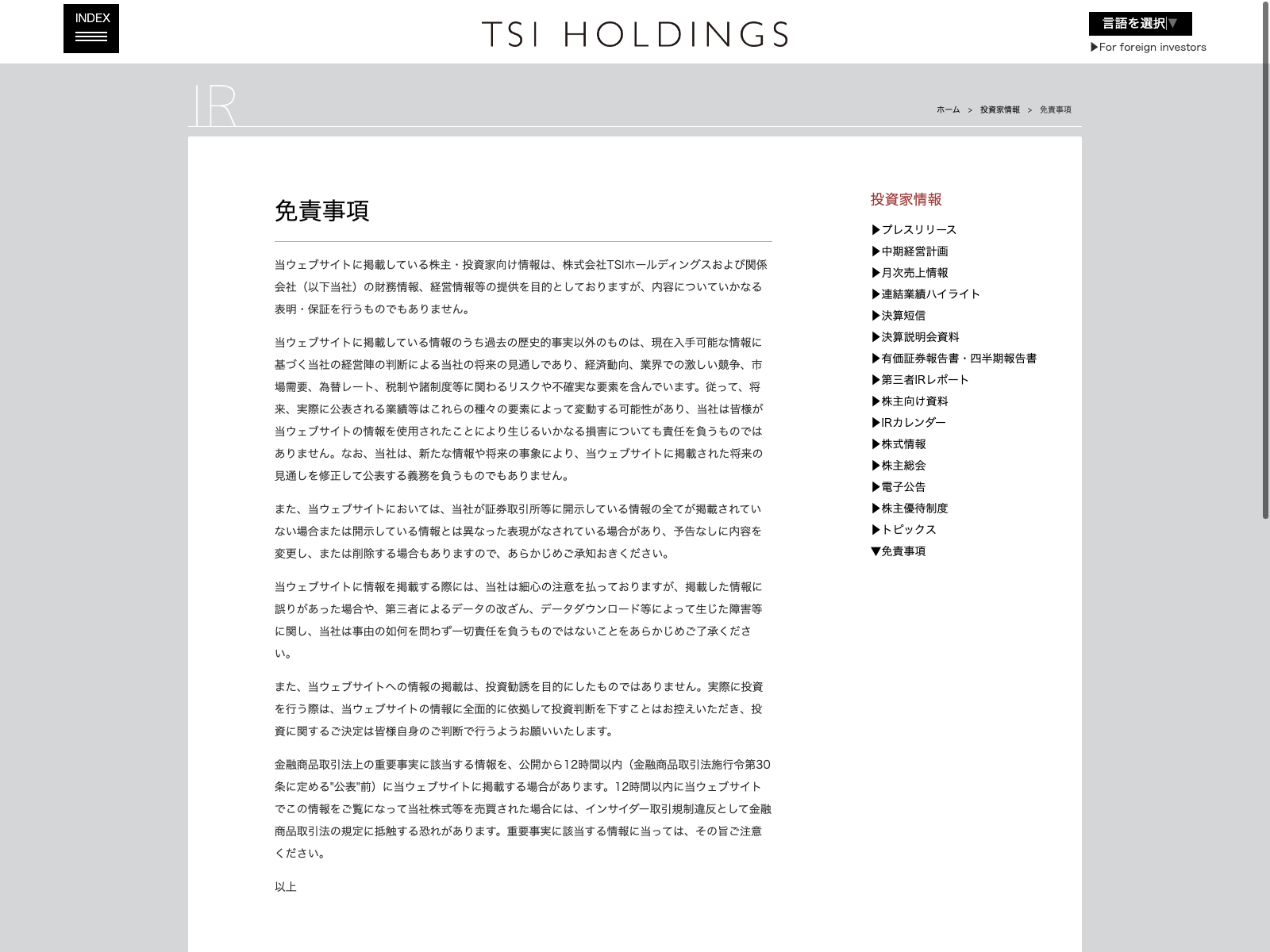 TSIホールディングス Update:2022.10.31 カテゴリー:プライム 繊維製品 IR情報 プライバシーポリシー 免責注意事項 有価証券報告書 沿革 経営理念 詳細 Visit 詳細 Visit