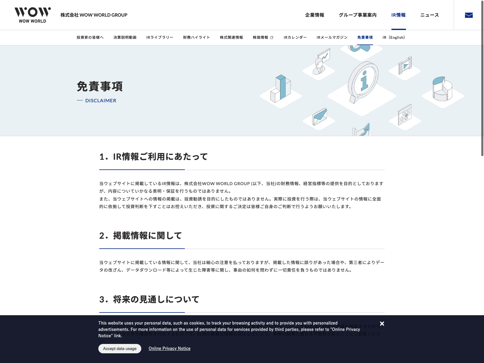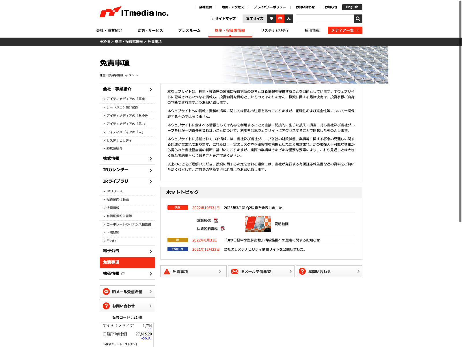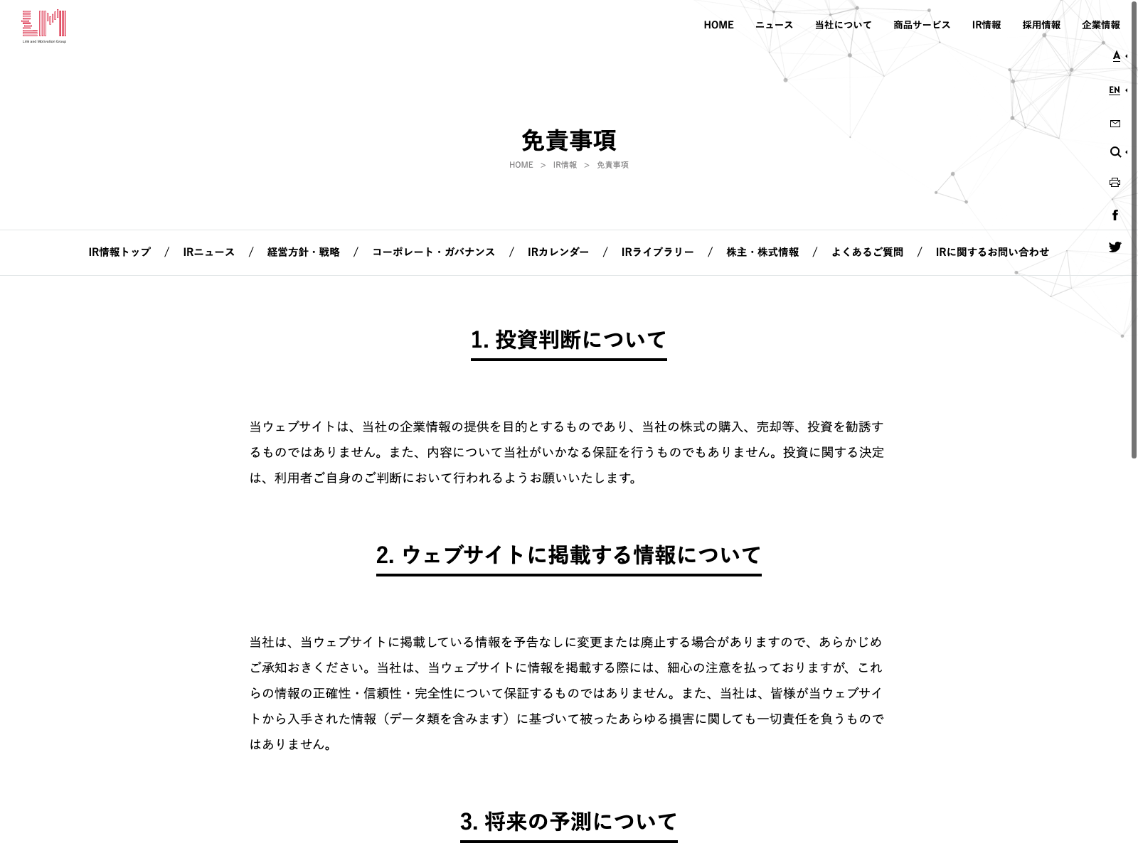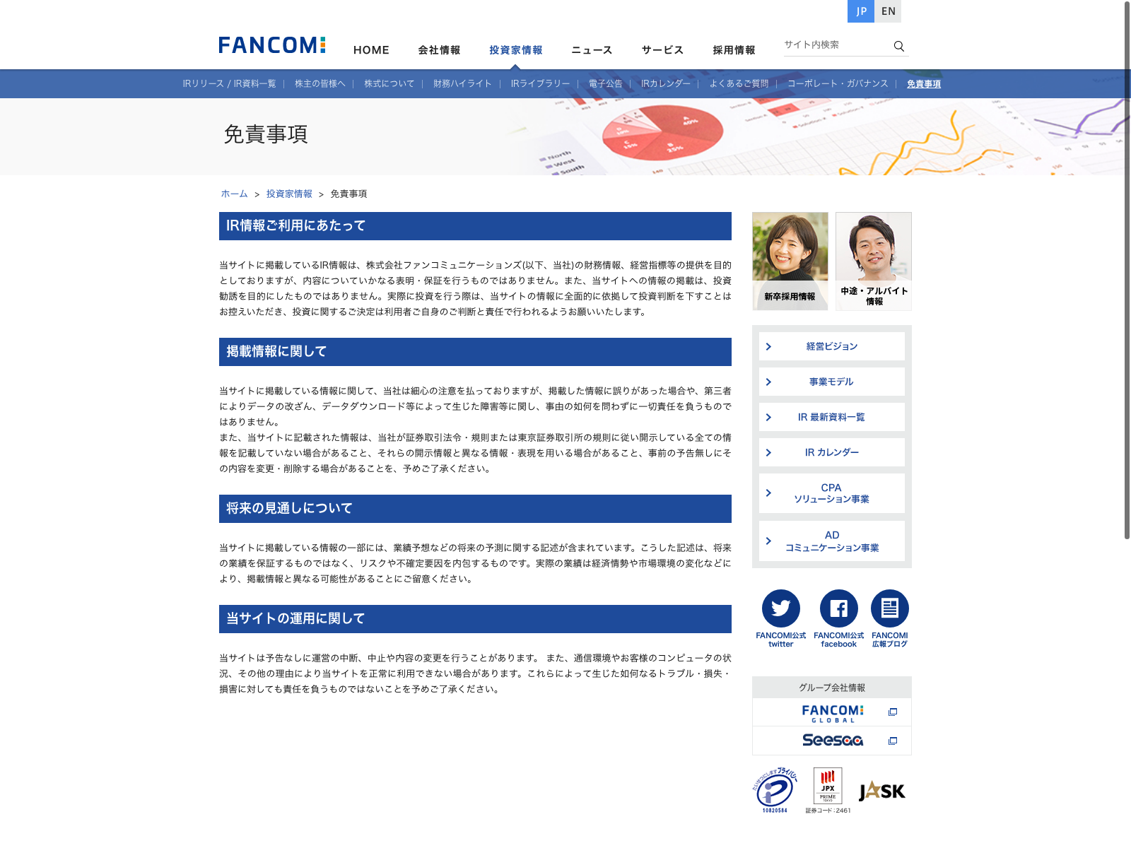 ファンコミュニケーションズ Update:2022.10.31 カテゴリー:プライム サービス業 IR情報 ニュース一覧 ビジョン プライバシーポリシー 免責注意事項 沿革 詳細 Visit 詳細 Visit