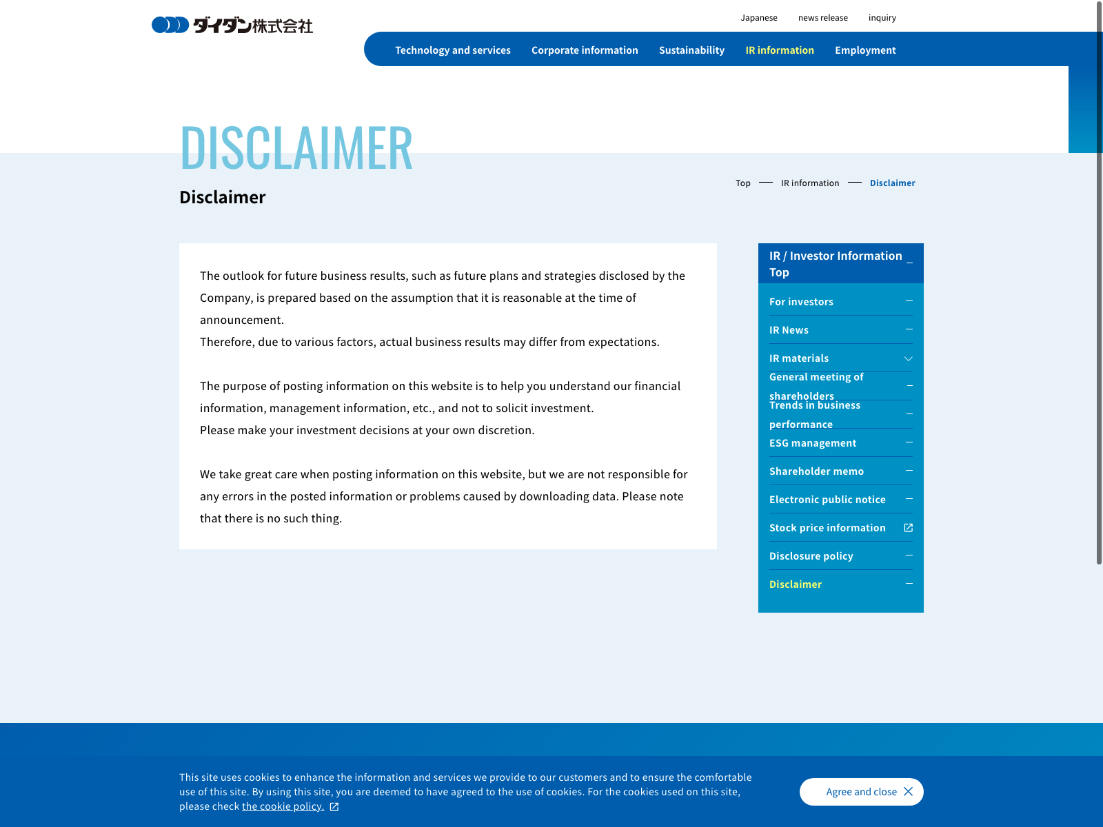 ダイダン Update:2022.10.31 カテゴリー:プライム 建設業 サステナビリティ ニュース一覧 プライバシーポリシー 免責注意事項 情報セキュリティ 沿革 詳細 Visit 詳細 Visit