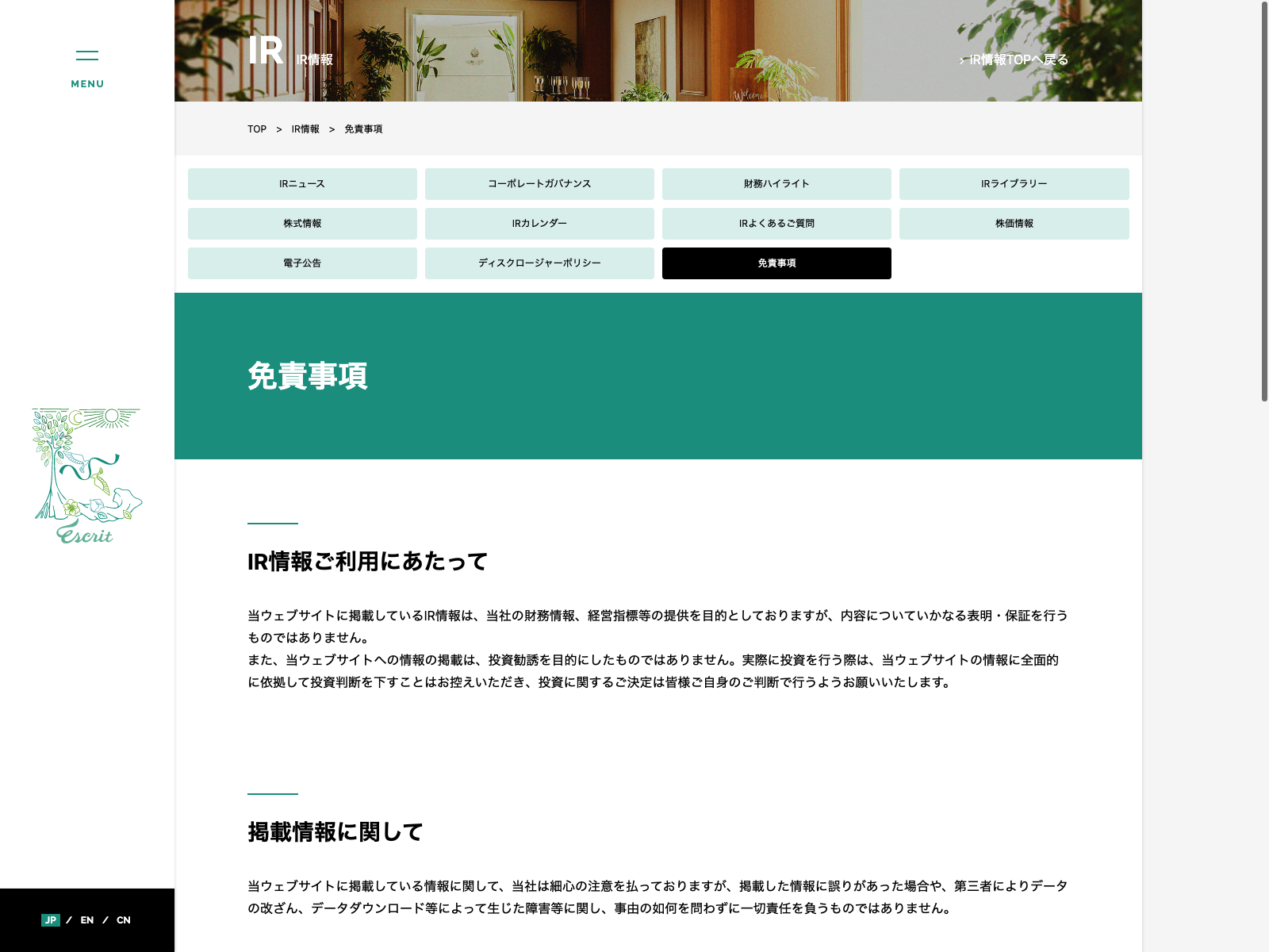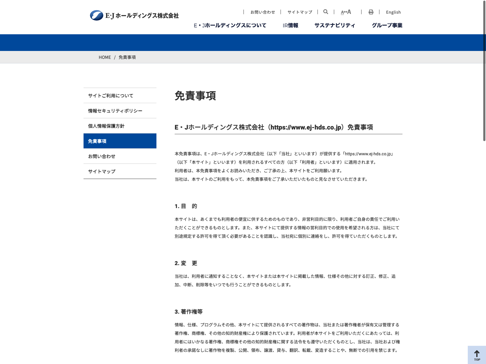 E・Jホールディングス Update:2022.10.31 カテゴリー:プライム サービス業 コンプライアンス サステナビリティ プライバシーポリシー 免責注意事項 情報セキュリティ 有価証券報告書 沿革 詳細 Visit 詳細 Visit