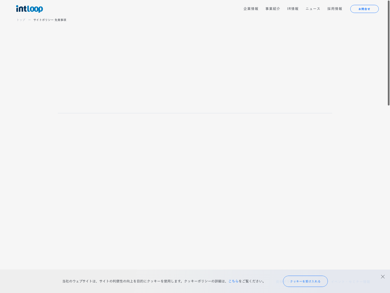 INTLOOP Update:2022.10.31 カテゴリー:グロース サービス業 サステナビリティ プライバシーポリシー 事業内容 免責注意事項 沿革 社長メッセージ 詳細 Visit 詳細 Visit