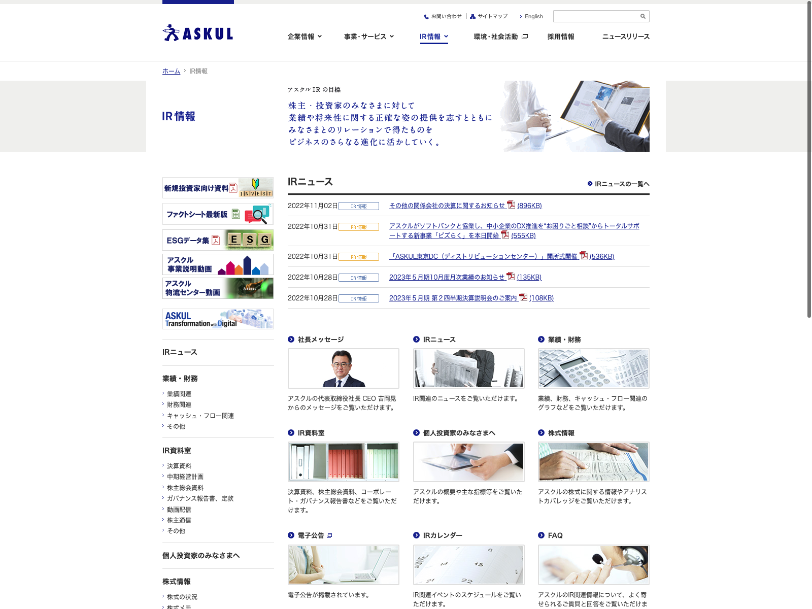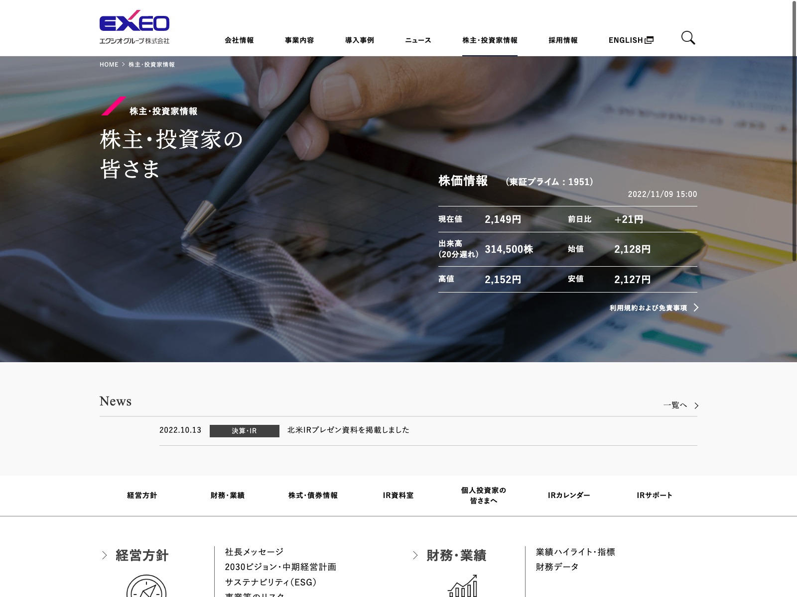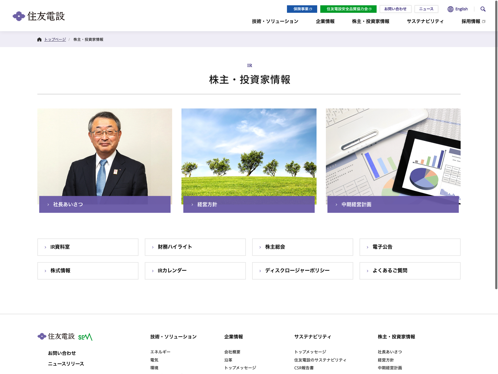 住友電設 Update:2022.10.31 カテゴリー:プライム 建設業 IR情報 サステナビリティ ニュース一覧 プライバシーポリシー 沿革 社長メッセージ 経営理念 詳細 Visit 詳細 Visit