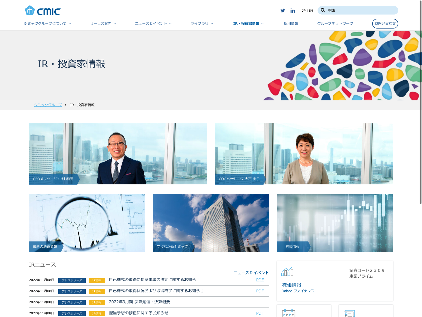 シミックホールディングス Update:2022.10.31 カテゴリー:プライム サービス業 IR情報 コンプライアンス プライバシーポリシー 事業内容 免責注意事項 情報セキュリティ 有価証券報告書 沿革 詳細 Visit 詳細 Visit
