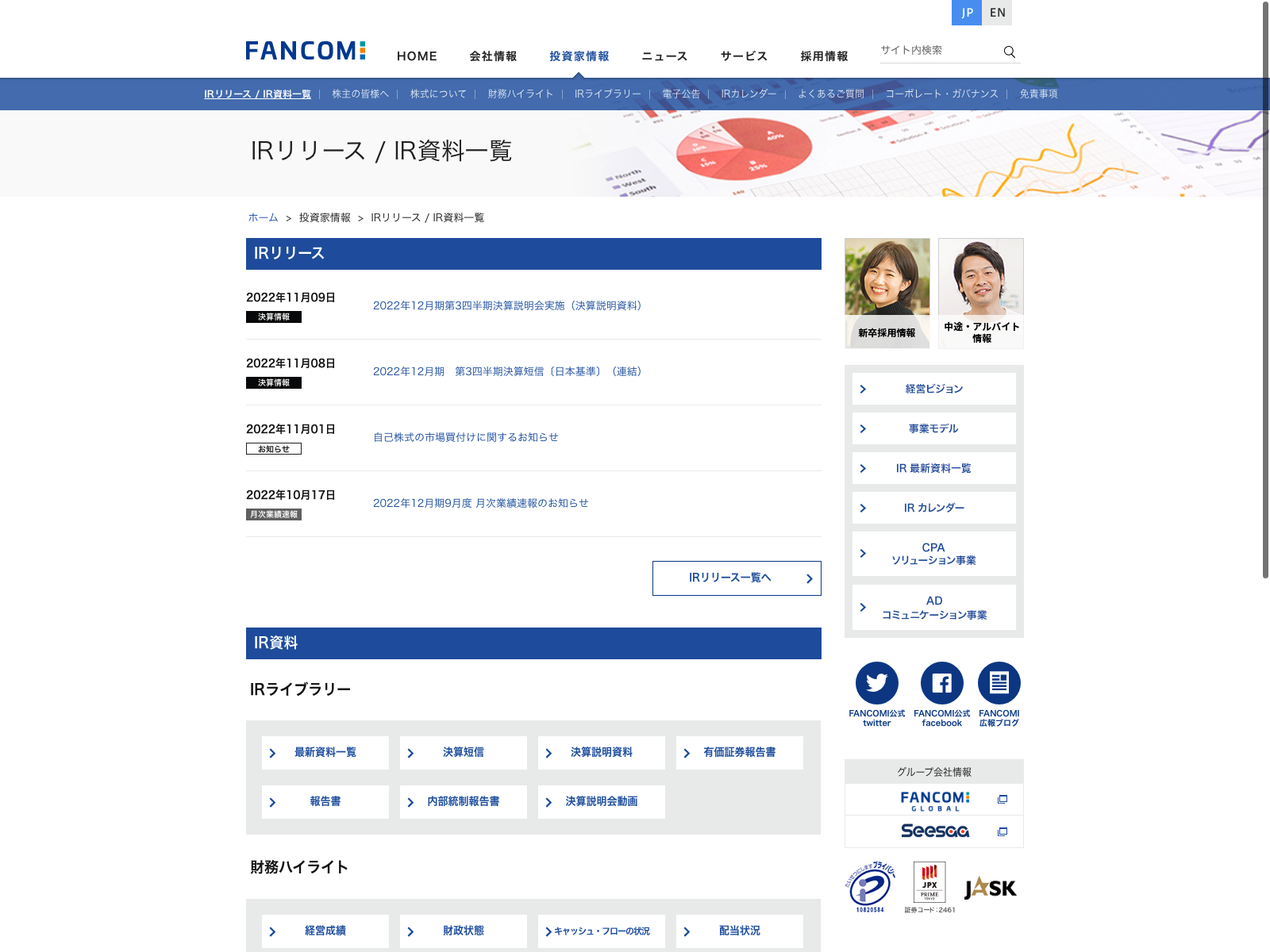 ファンコミュニケーションズ Update:2022.10.31 カテゴリー:プライム サービス業 IR情報 ニュース一覧 ビジョン プライバシーポリシー 免責注意事項 沿革 詳細 Visit 詳細 Visit