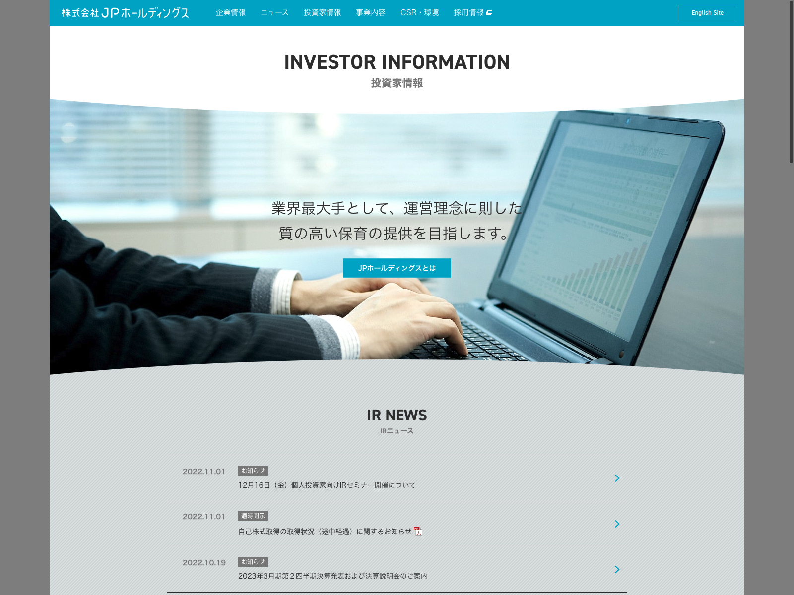 JPホールディングス Update:2022.10.31 カテゴリー:プライム サービス業 IR情報 ニュース一覧 プライバシーポリシー 事業内容 免責注意事項 沿革 詳細 Visit 詳細 Visit