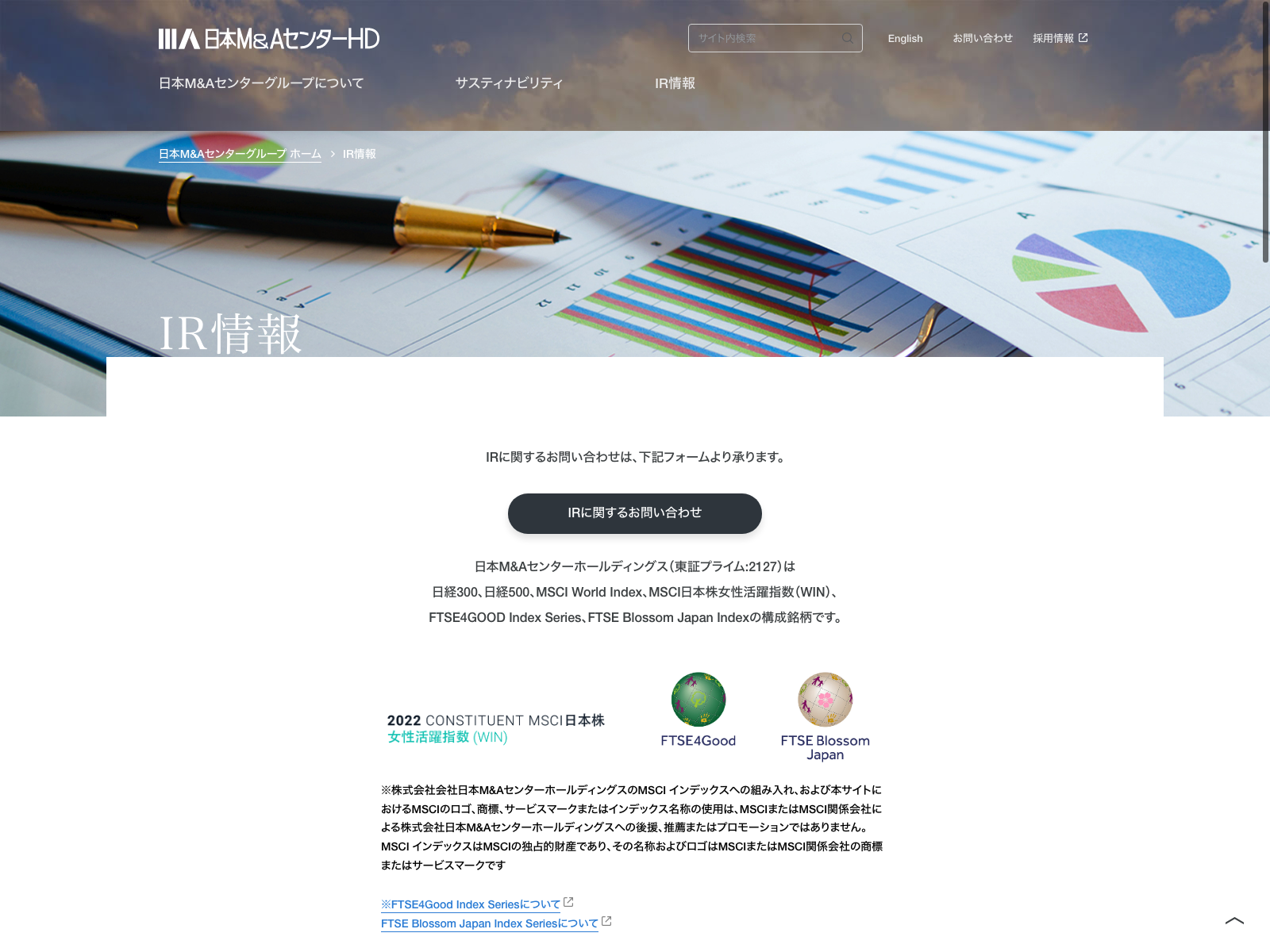 日本M&Aセンターホールディングス Update:2022.10.31 カテゴリー:プライム サービス業 IR情報 ニュース一覧 プライバシーポリシー 情報セキュリティ 沿革 詳細 Visit 詳細 Visit