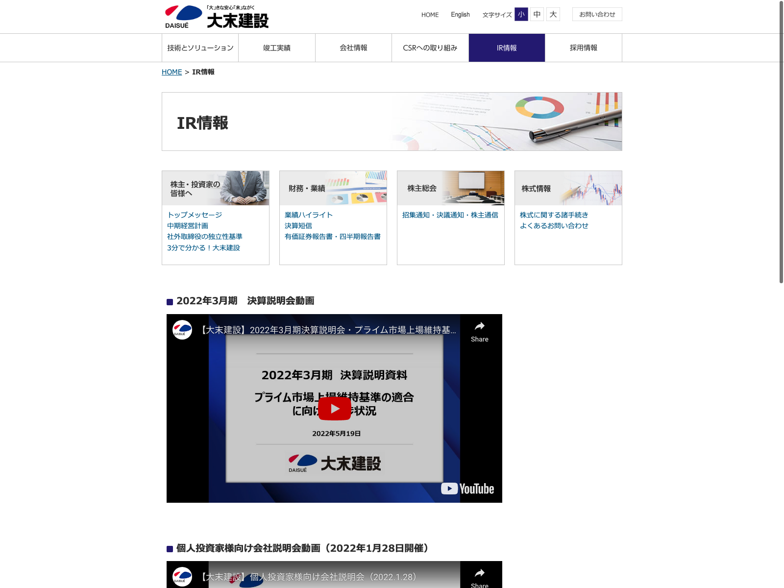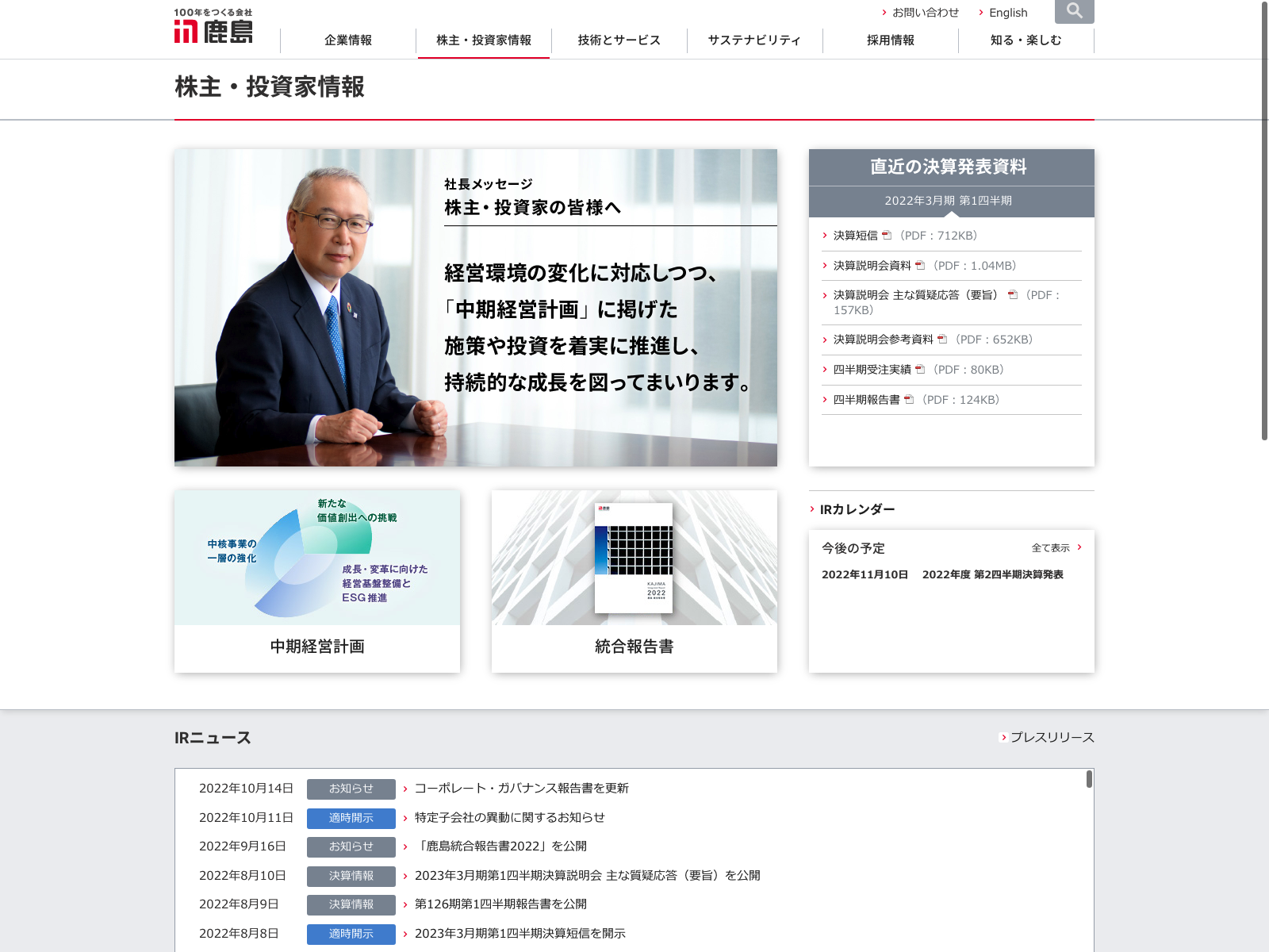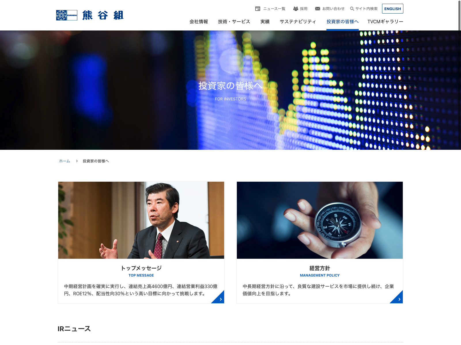 熊谷組 Update:2022.10.31 カテゴリー:プライム 建設業 IR情報 サステナビリティ ニュース一覧 ビジョン プライバシーポリシー 沿革 社長メッセージ 経営理念 詳細 Visit 詳細 Visit