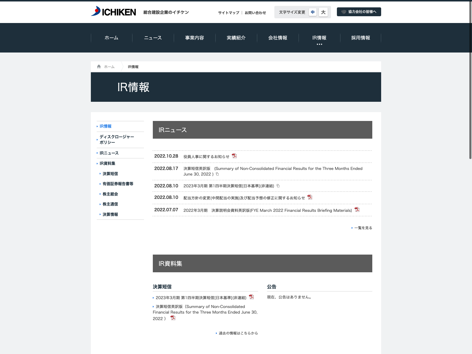 イチケン Update:2022.10.31 カテゴリー:プライム 建設業 IR情報 コンプライアンス ニュース一覧 プライバシーポリシー 事業内容 有価証券報告書 沿革 詳細 Visit 詳細 Visit