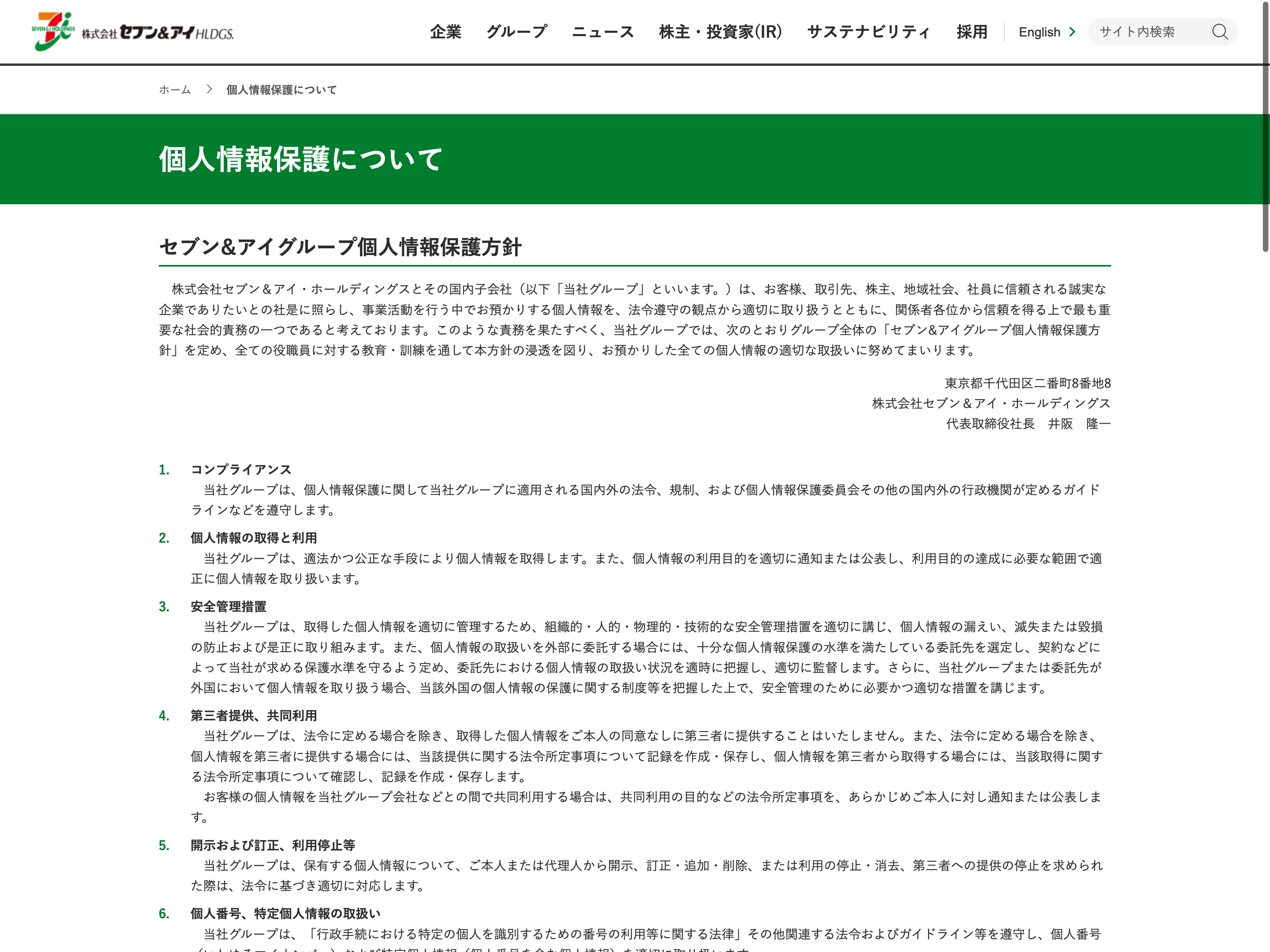 セブン&アイ・ホールディングス Update:2022.10.31 カテゴリー:プライム 小売業 サステナビリティ プライバシーポリシー 情報セキュリティ 沿革 社長メッセージ 経営理念 詳細 Visit 詳細 Visit