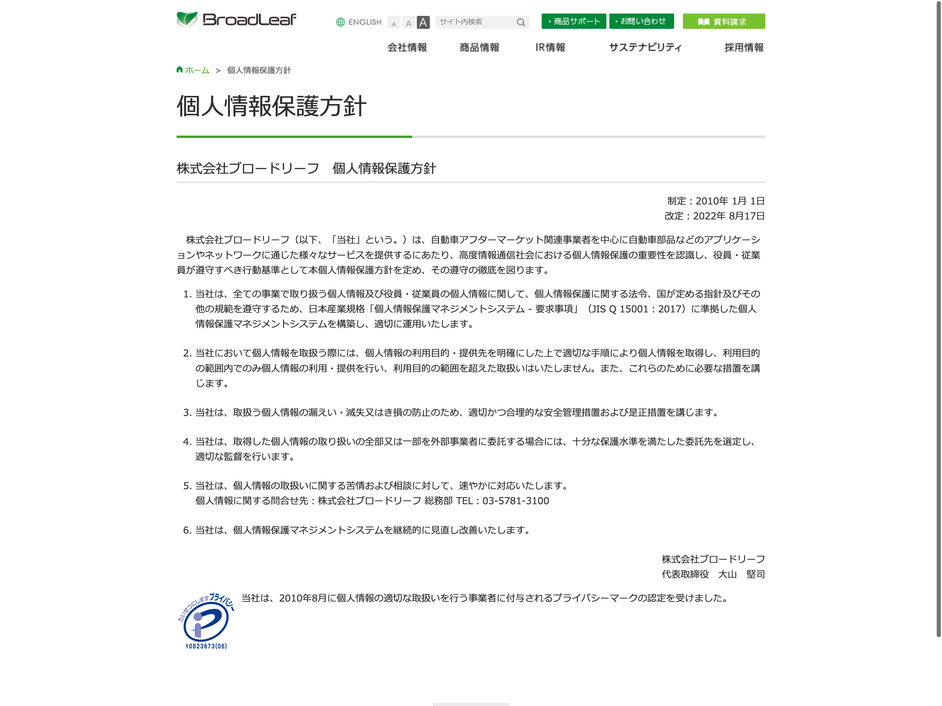 ブロードリーフ Update:2022.10.31 カテゴリー:プライム 情報・通信業 コンプライアンス サステナビリティ プライバシーポリシー 事業内容 免責注意事項 情報セキュリティ 有価証券報告書 沿革 社長メッセージ 詳細 Visit 詳細 Visit