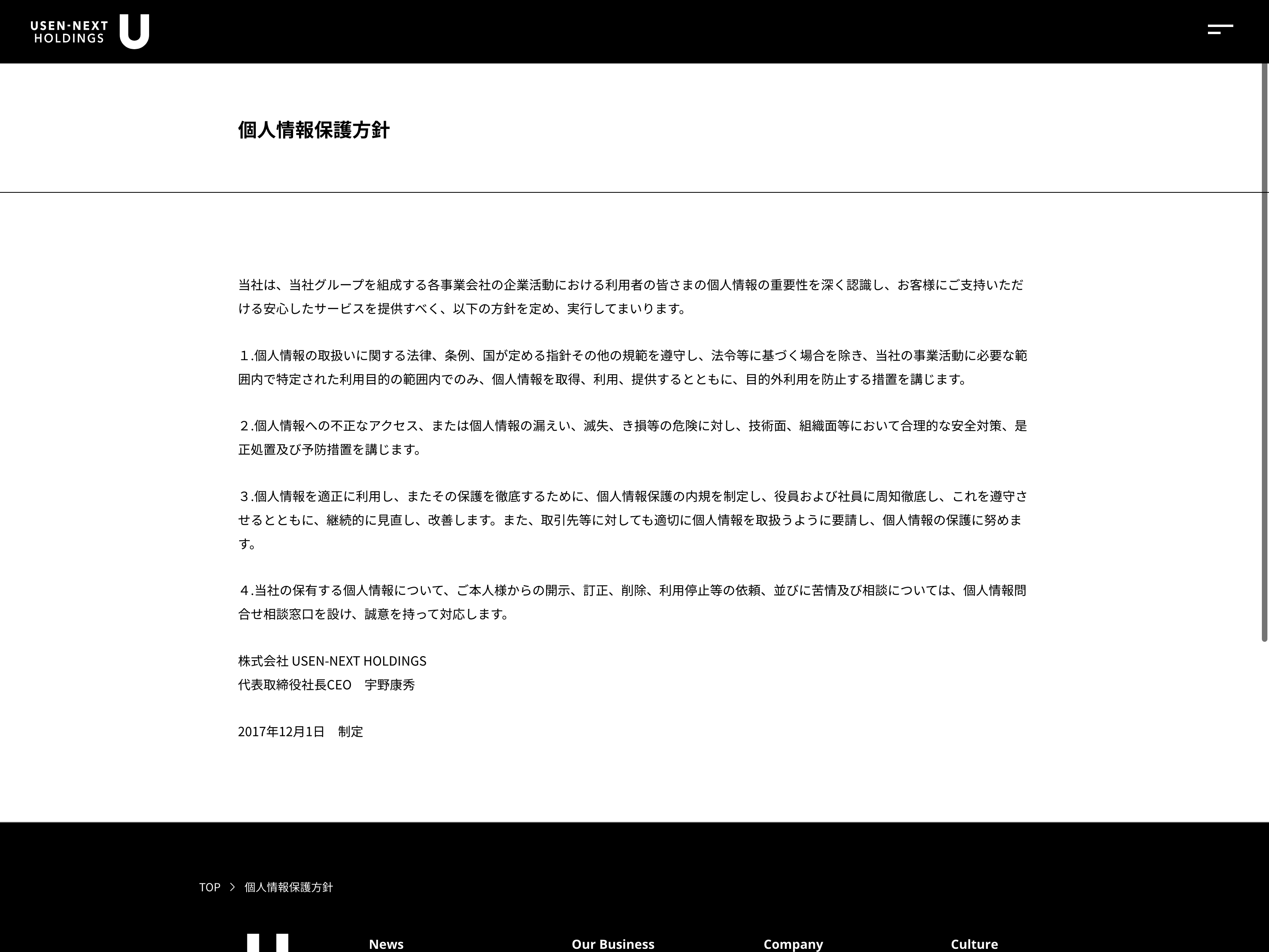 USEN-NEXT HOLDINGS Update:2022.10.31 カテゴリー:プライム 情報・通信業 サステナビリティ ニュース一覧 プライバシーポリシー 事業内容 情報セキュリティ 沿革 社長メッセージ 詳細 Visit 詳細 Visit