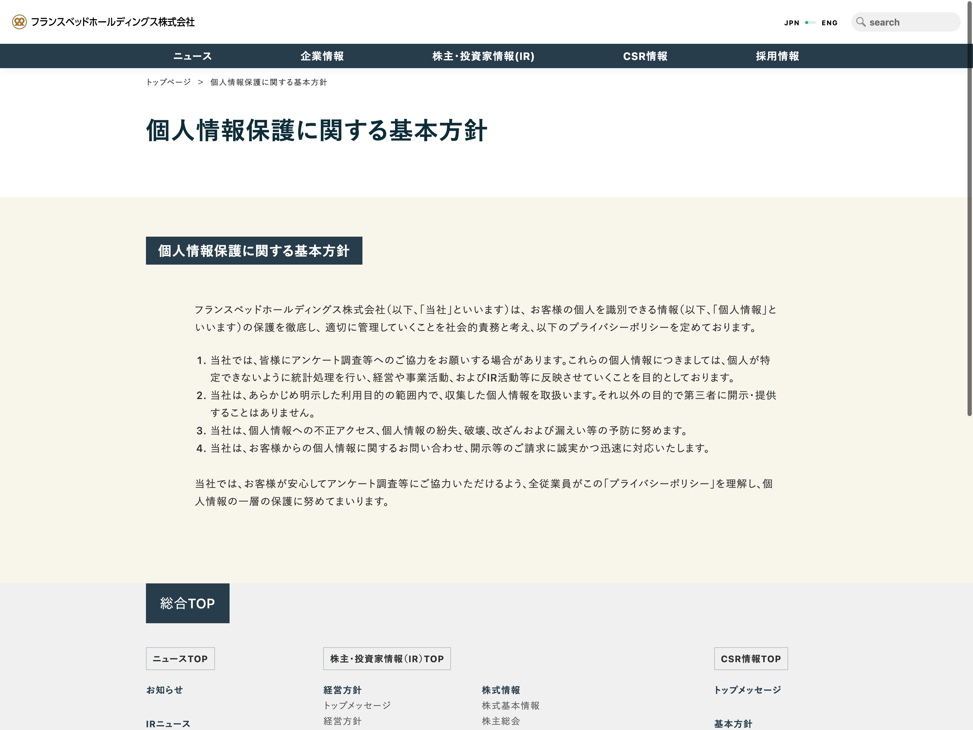 フランスベッドホールディングス Update:2022.10.31 カテゴリー:プライム その他製品 プライバシーポリシー 事業内容 有価証券報告書 社長メッセージ 経営理念 詳細 Visit 詳細 Visit