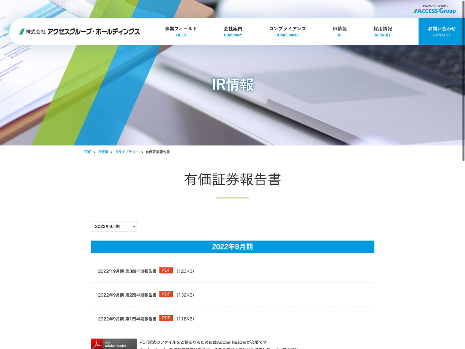 アクセスグループ・ホールディングス Update:2022.10.31 カテゴリー:スタンダード サービス業 コンプライアンス 免責注意事項 有価証券報告書 沿革 社長メッセージ 経営理念 詳細 Visit 詳細 Visit