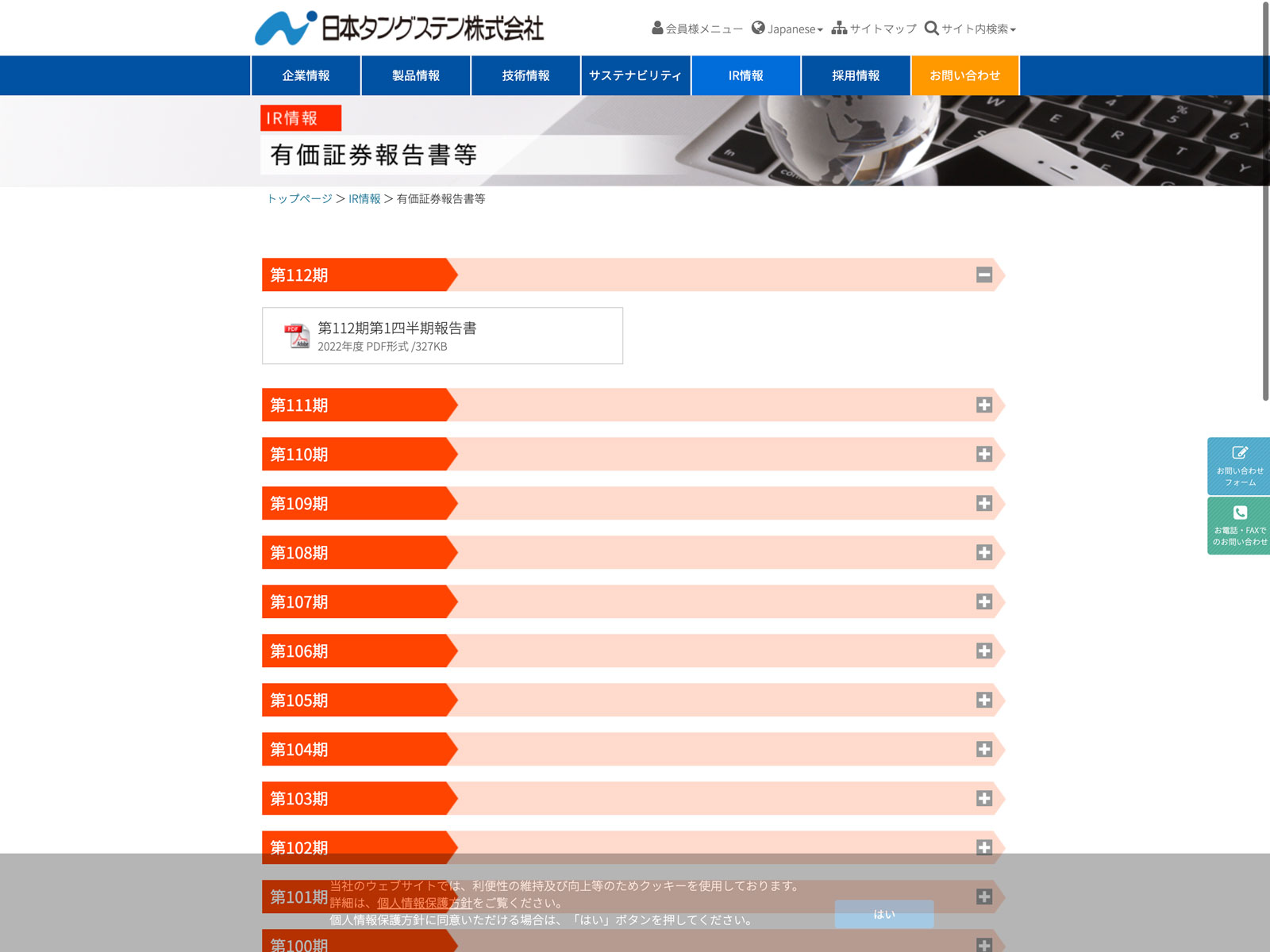 日本タングステン Update:2022.10.31 カテゴリー:スタンダード 電気機器 コンプライアンス サステナビリティ プライバシーポリシー 事業内容 有価証券報告書 沿革 詳細 Visit 詳細 Visit