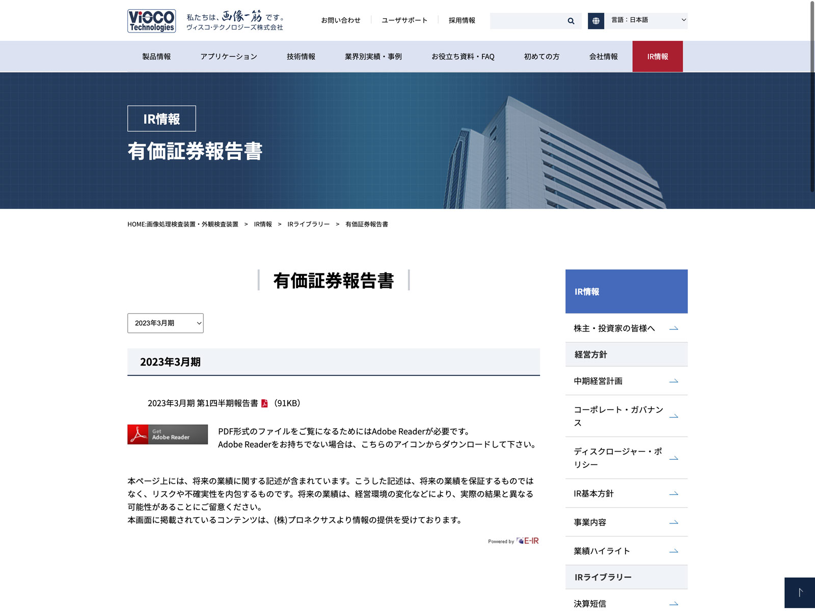 ヴィスコ・テクノロジーズ Update:2022.10.31 カテゴリー:スタンダード 電気機器 ニュース一覧 プライバシーポリシー 事業内容 免責注意事項 有価証券報告書 沿革 社長メッセージ 詳細 Visit 詳細 Visit