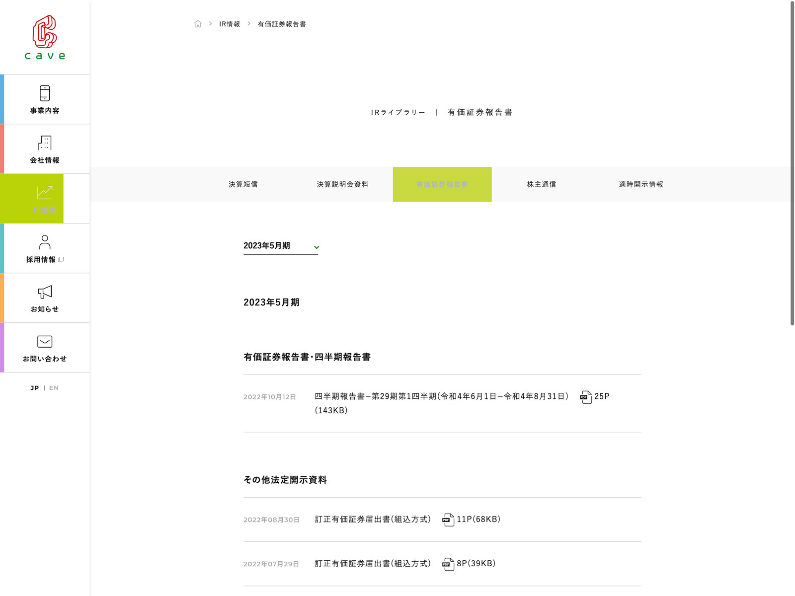ケイブ Update:2022.10.31 カテゴリー:スタンダード 情報・通信業 コンプライアンス ニュース一覧 事業内容 免責注意事項 有価証券報告書 沿革 社長メッセージ 詳細 Visit 詳細 Visit