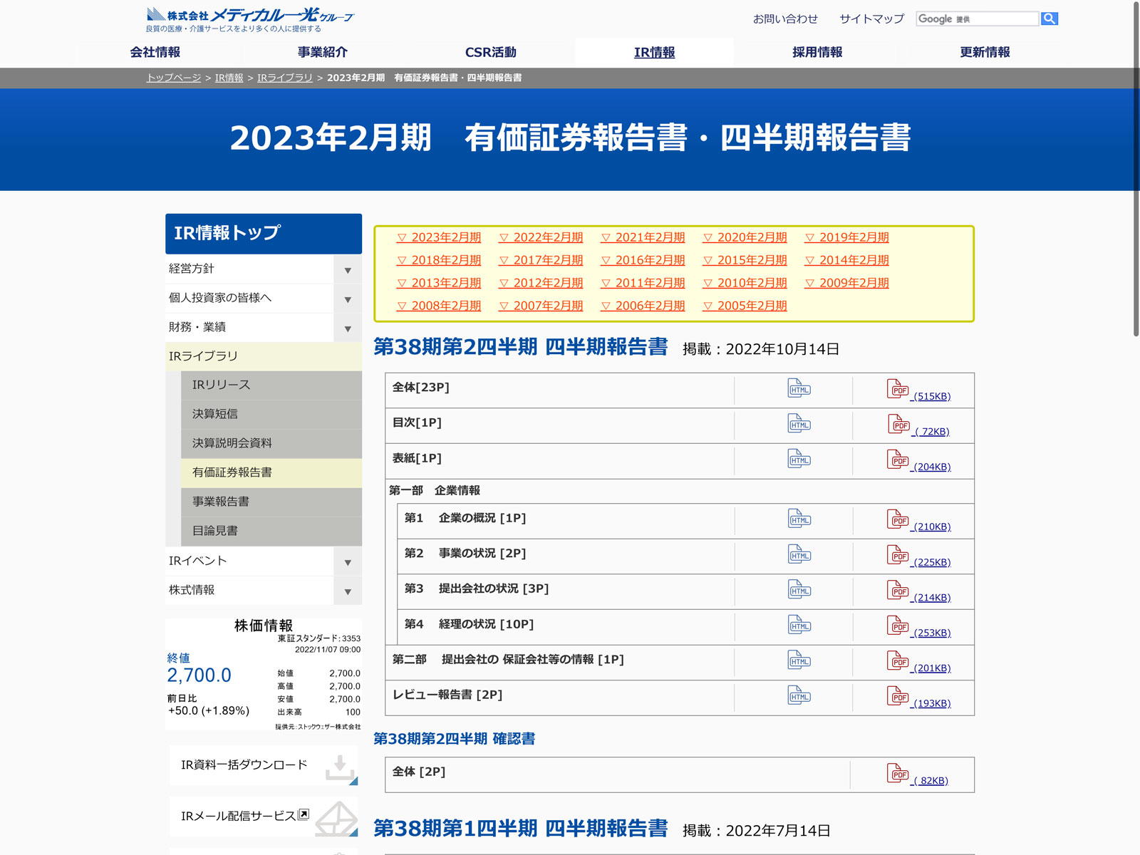 メディカル一光グループ Update:2022.10.31 カテゴリー:スタンダード 小売業 ニュース一覧 プライバシーポリシー 事業内容 有価証券報告書 沿革 経営理念 詳細 Visit 詳細 Visit