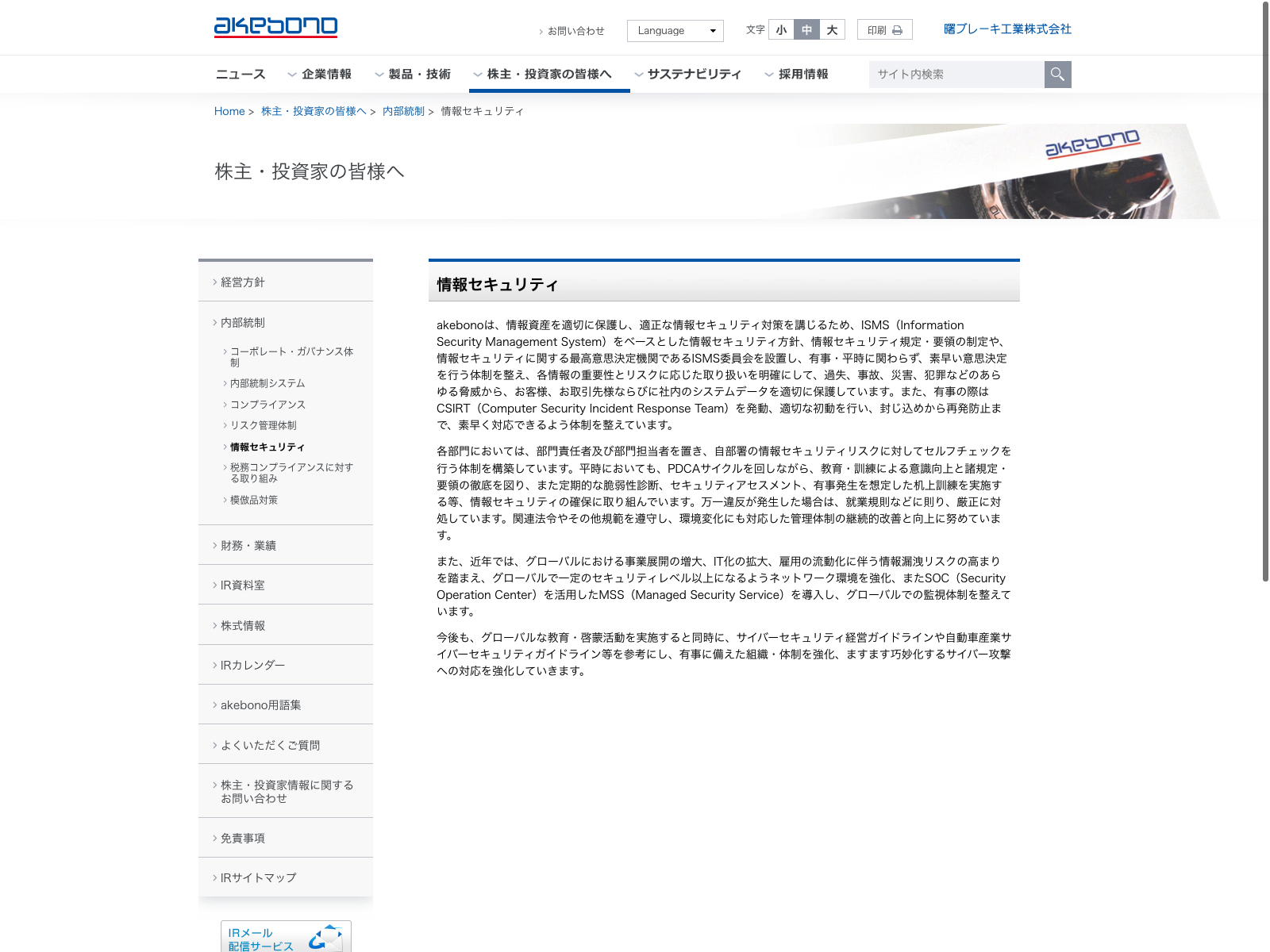 曙ブレーキ工業 Update:2022.10.31 カテゴリー:プライム 輸送用機器 コンプライアンス サステナビリティ ニュース一覧 プライバシーポリシー 事業内容 免責注意事項 情報セキュリティ 有価証券報告書 沿革 詳細 Visit 詳細 Visit