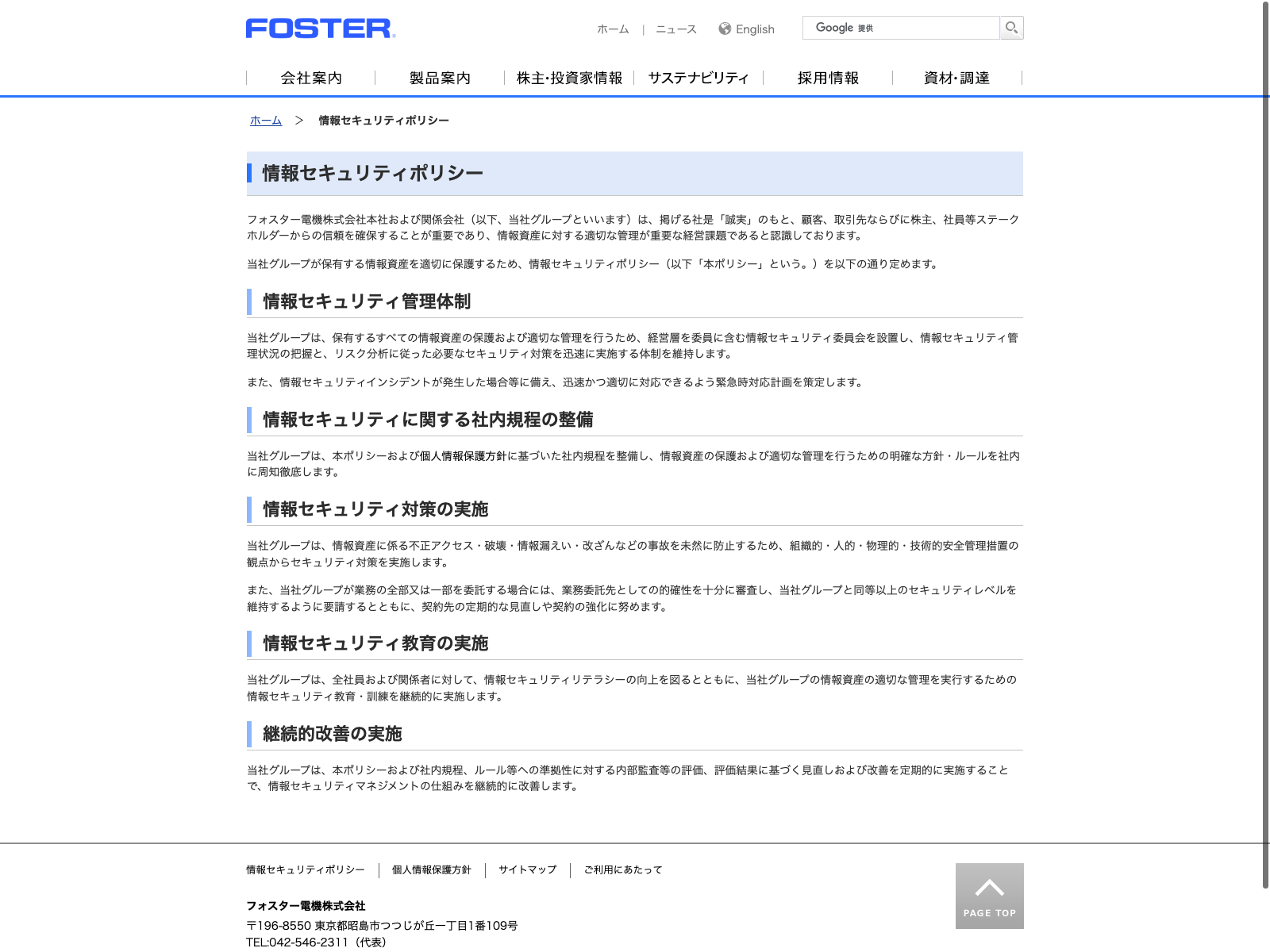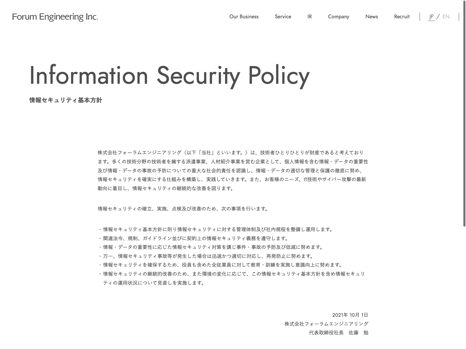 フォーラムエンジニアリング Update:2022.10.31 カテゴリー:プライム サービス業 コンプライアンス サステナビリティ プライバシーポリシー 免責注意事項 情報セキュリティ 沿革 社長メッセージ 詳細 Visit 詳細 Visit
