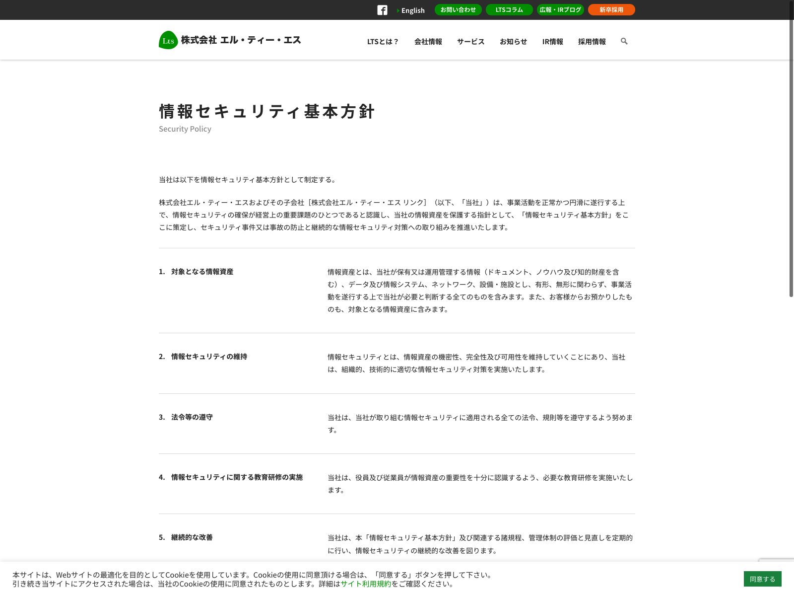 エル・ティー・エス Update:2022.10.31 カテゴリー:プライム サービス業 サステナビリティ プライバシーポリシー 事業内容 情報セキュリティ 経営理念 詳細 Visit 詳細 Visit