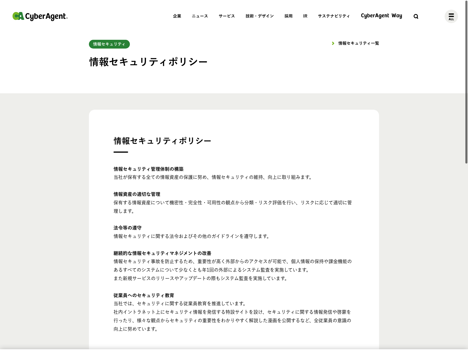 サイバーエージェント Update:2022.10.31 カテゴリー:プライム サービス業 コンプライアンス サステナビリティ ニュース一覧 ビジョン プライバシーポリシー 情報セキュリティ 有価証券報告書 沿革 詳細 Visit 詳細 Visit