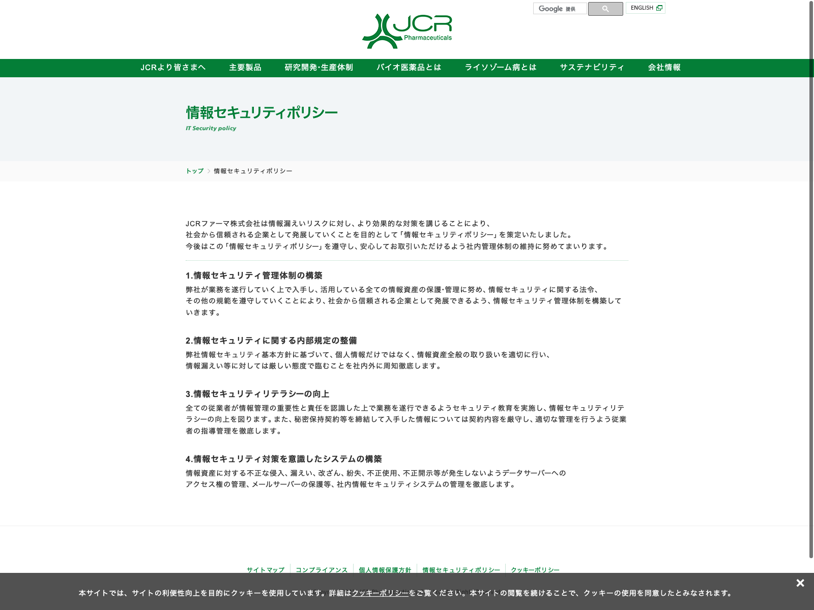 JCRファーマ Update:2022.10.31 カテゴリー:プライム 医薬品 コンプライアンス サステナビリティ プライバシーポリシー 情報セキュリティ 沿革 社長メッセージ 詳細 Visit 詳細 Visit