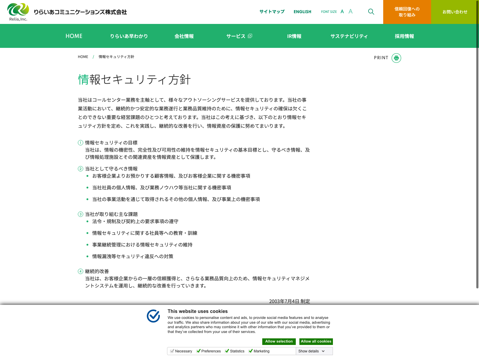 りらいあコミュニケーションズ Update:2022.10.31 カテゴリー:プライム サービス業 コンプライアンス サステナビリティ 免責注意事項 情報セキュリティ 有価証券報告書 沿革 詳細 Visit 詳細 Visit