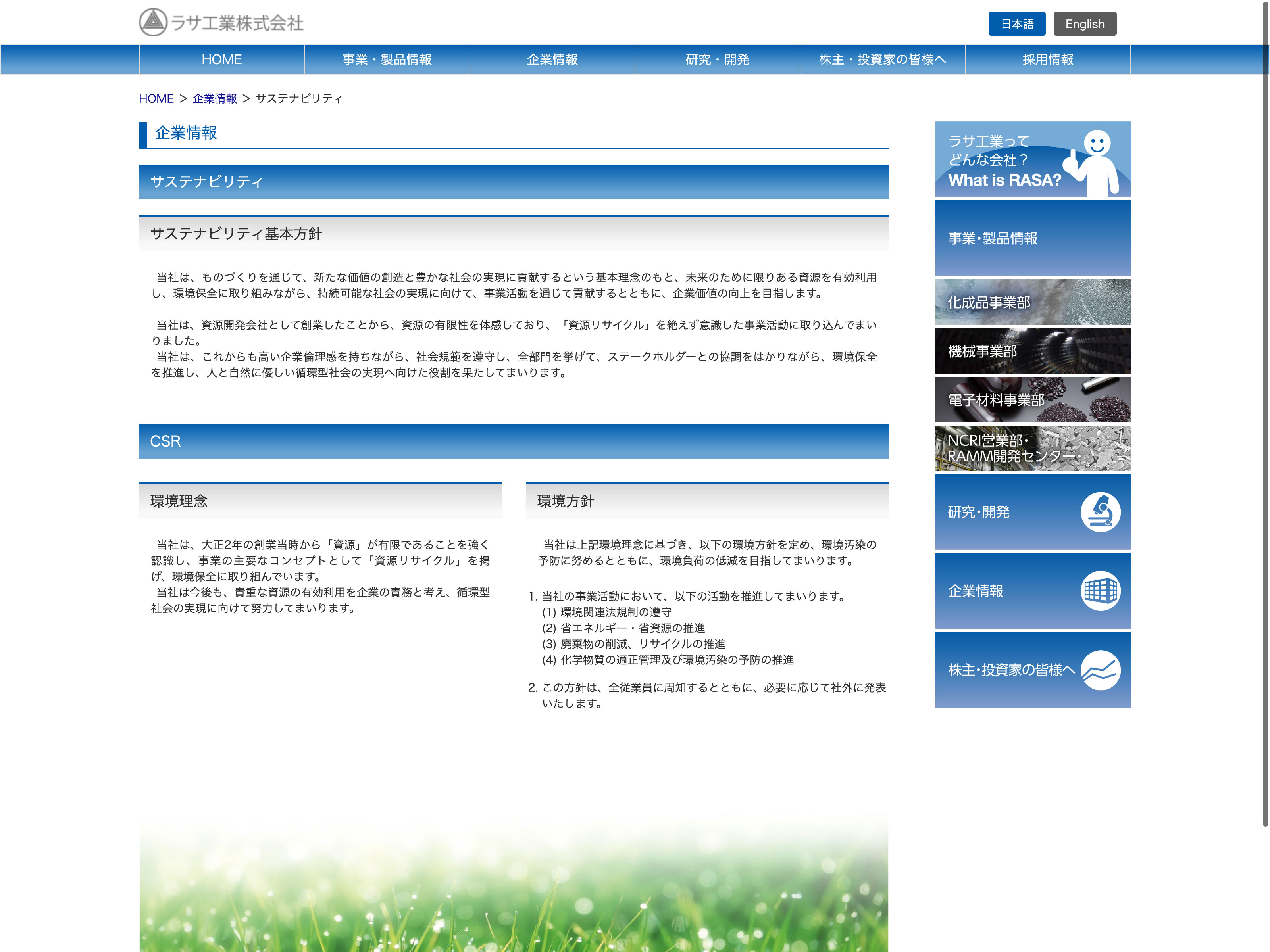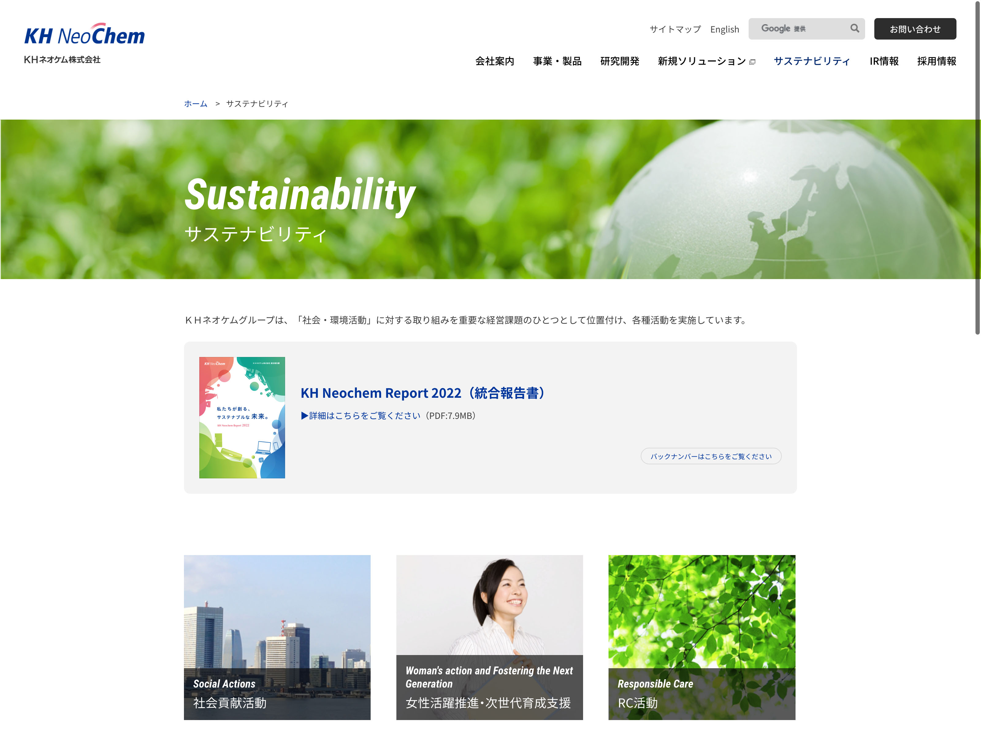 KHネオケム Update:2022.10.31 カテゴリー:プライム 化学 サステナビリティ ニュース一覧 プライバシーポリシー 事業内容 免責注意事項 沿革 社長メッセージ 詳細 Visit 詳細 Visit
