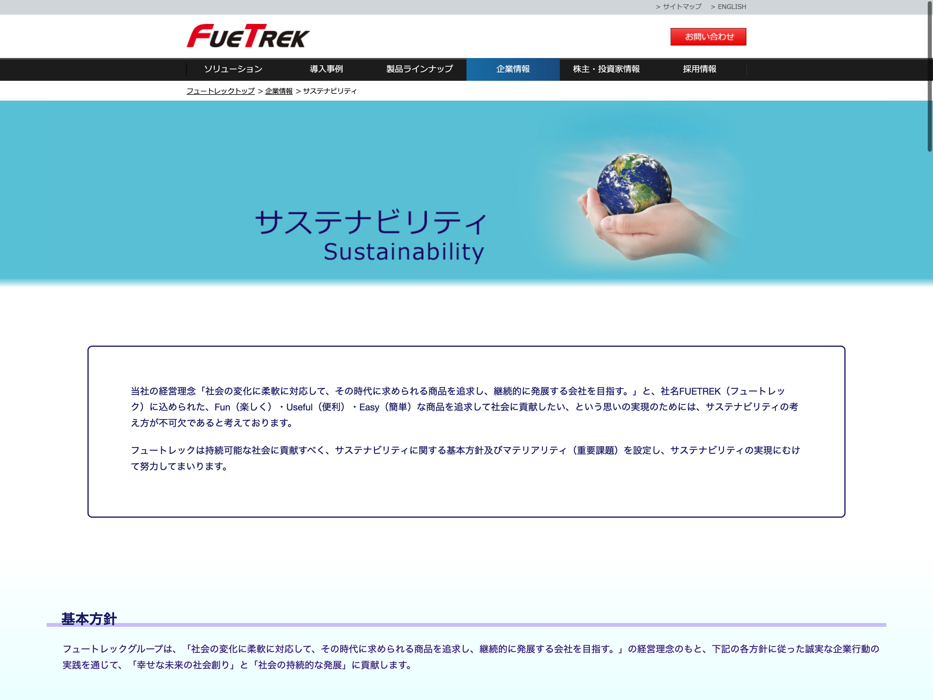 フュートレック Update:2022.10.31 カテゴリー:スタンダード サービス業 サステナビリティ プライバシーポリシー 事業内容 免責注意事項 情報セキュリティ 沿革 詳細 Visit 詳細 Visit