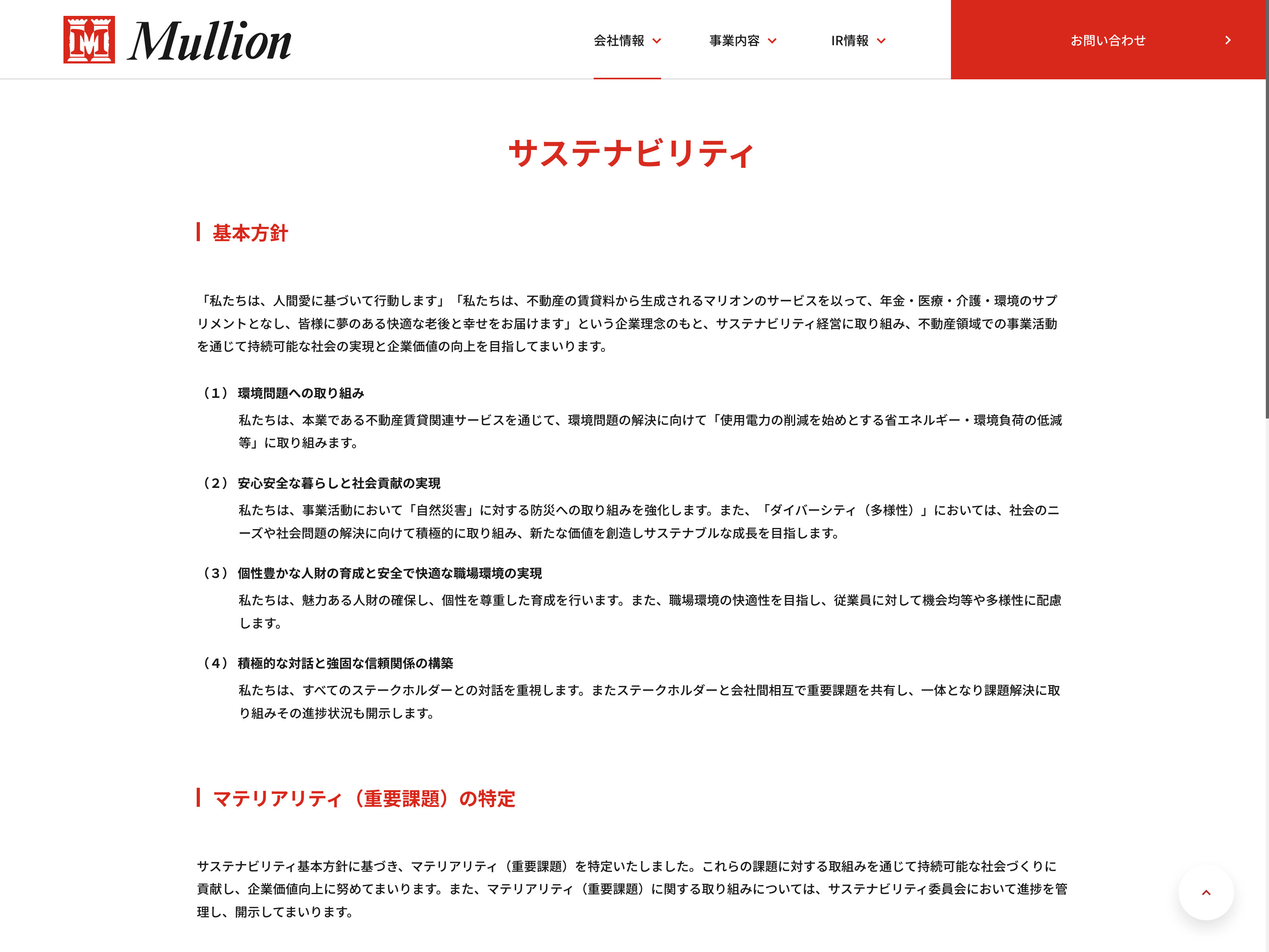 マリオン Update:2022.10.31 カテゴリー:スタンダード 不動産業 サステナビリティ ニュース一覧 プライバシーポリシー 事業内容 免責注意事項 情報セキュリティ 沿革 詳細 Visit 詳細 Visit